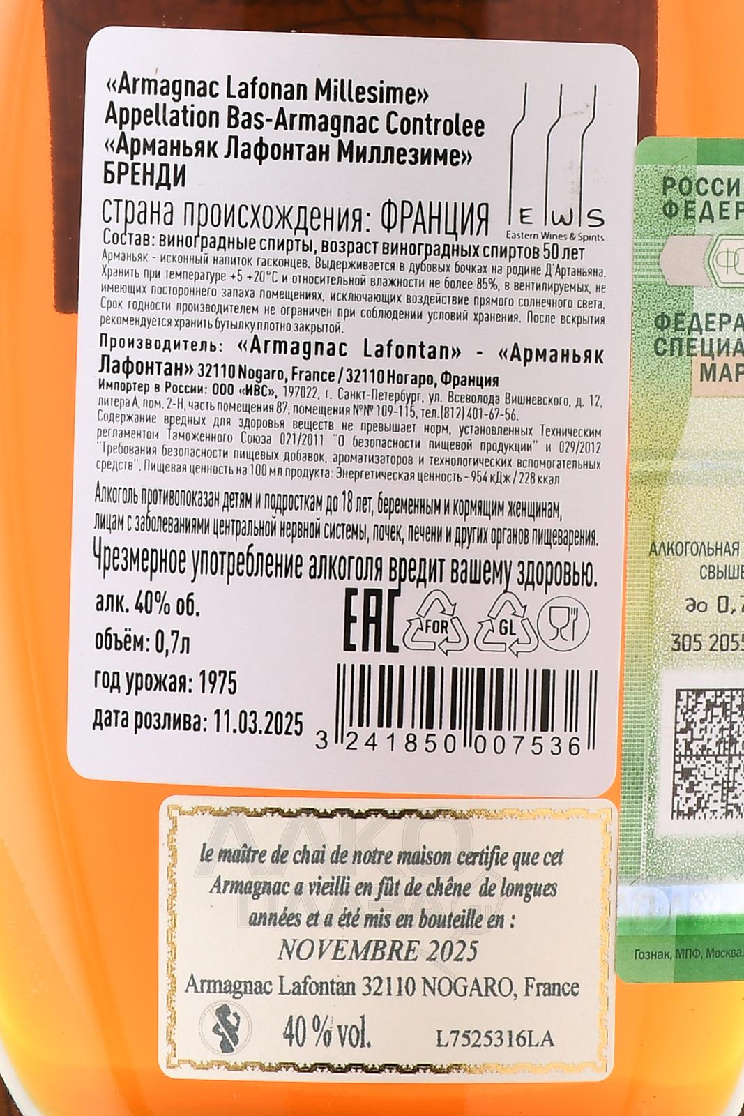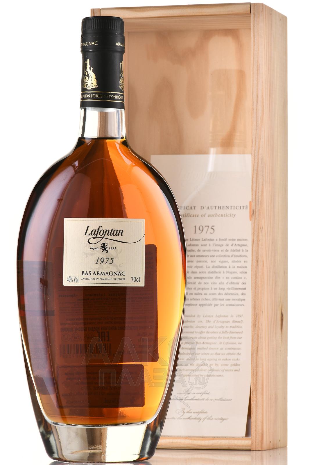 Арманьяк Lafontan Millesime 1975 г 0.7 л в д/у — премиальный винтаж с уровнем спиртуозности 40 градусов, который выпущен в эксклюзивной деревянной упаковке. Дом Lafontan создает свои напитки из таких сортов винограда, как Фоль Бланш, Бако и Уни Блан, выращенных в регионе Франции — Ба-Арманьяк. Выдержка в течение 40 лет проходит в бочках из древесины гасконского черного дуба. Миллезимный арманьяк — памятный подарок людям, родившимся в 1975 году.