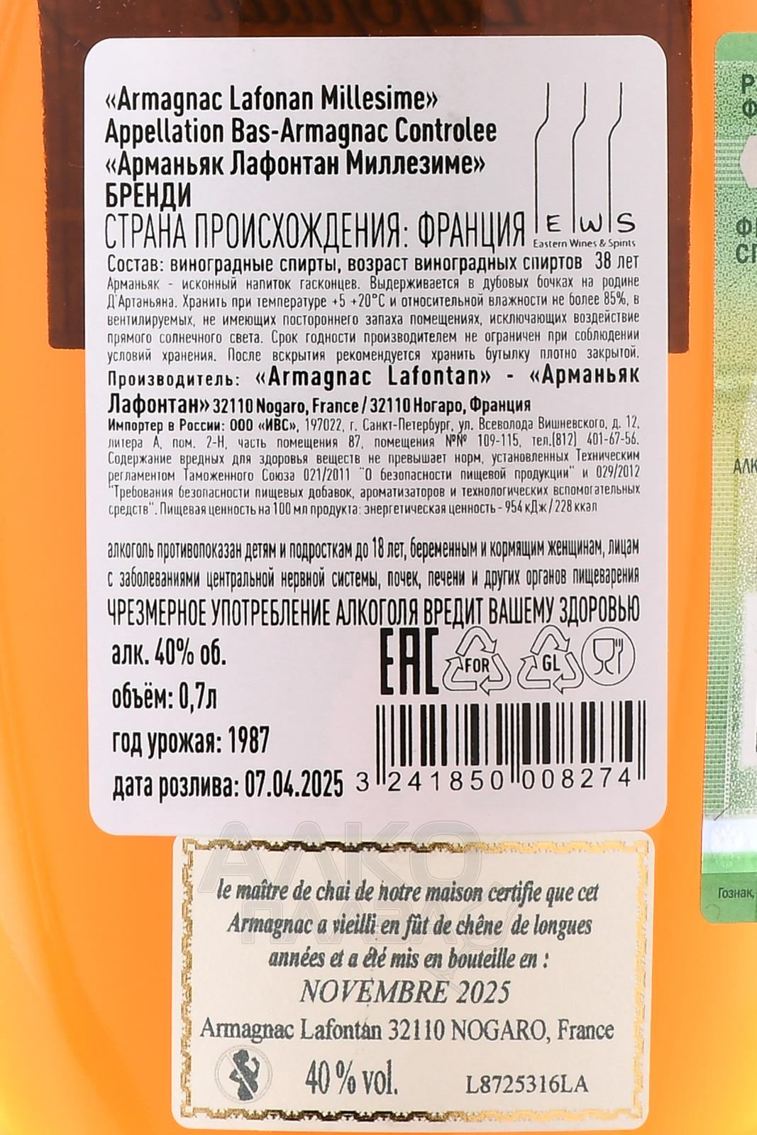 Lafontan Millesime 1987 - арманьяк Лафонтан Миллезим 1987 года 0.7 л