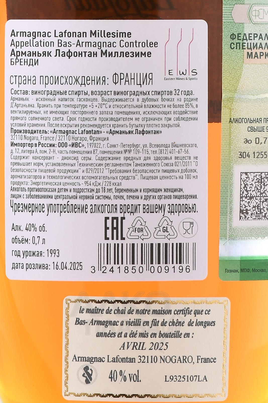 Lafontan Millesime 1993 - арманьяк Лафонтан Миллезим 1993 года 0.7 л