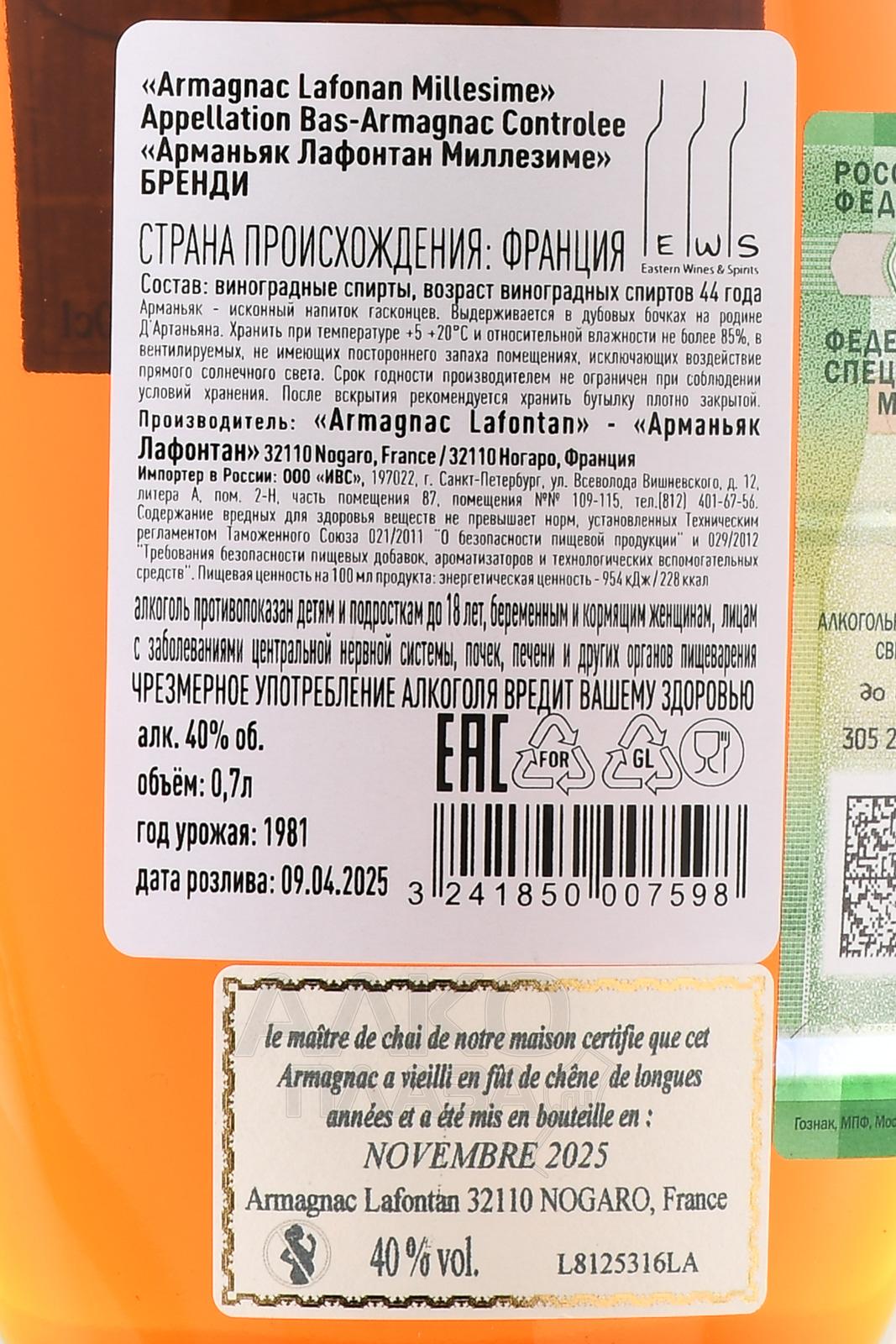 Lafontan Millesime 1981 - арманьяк Лафонтан Миллезим 1981 года 0.7 л