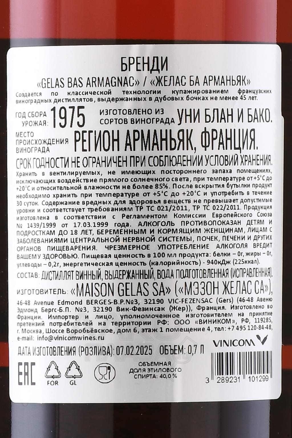 Gelas 1975 - арманьяк Желас 1975 года 0.7 л
