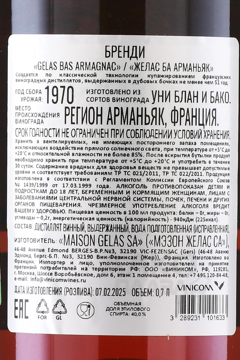Gelas 1970 - арманьяк Желас 1970 года 0.7 л
