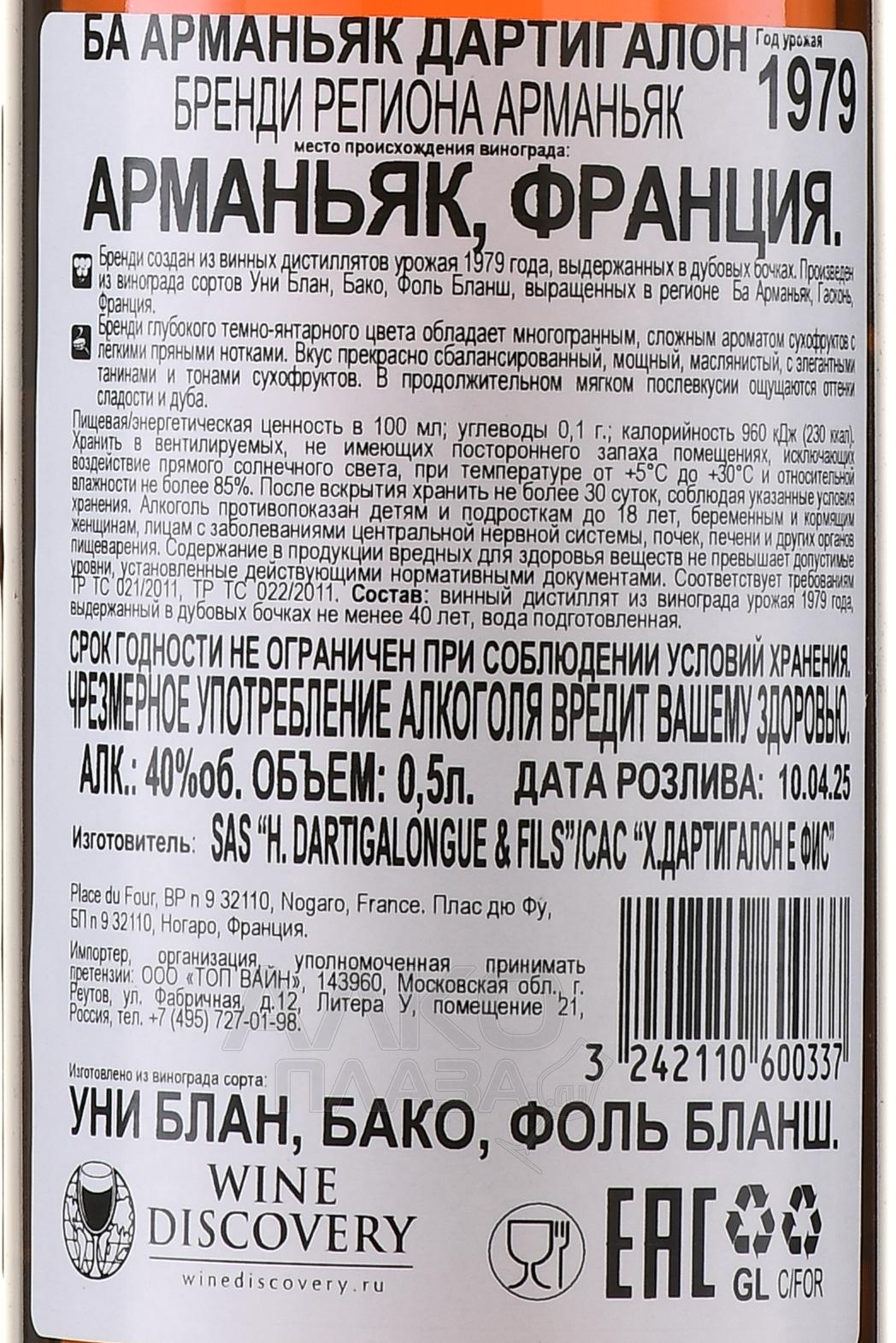 Dartigalongue 1979 - арманьяк Дартигалон 1979 года 0.5 л в д/у
