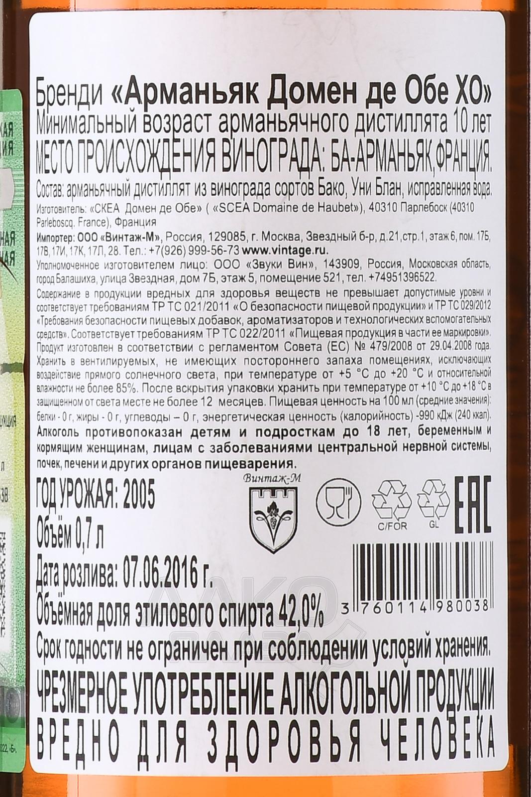 Armagnac Bas Armagnac Domaine de Haubet XO - арманьяк Домен де Обе ХО Ба-Арманьяк 8 лет 0.7 л