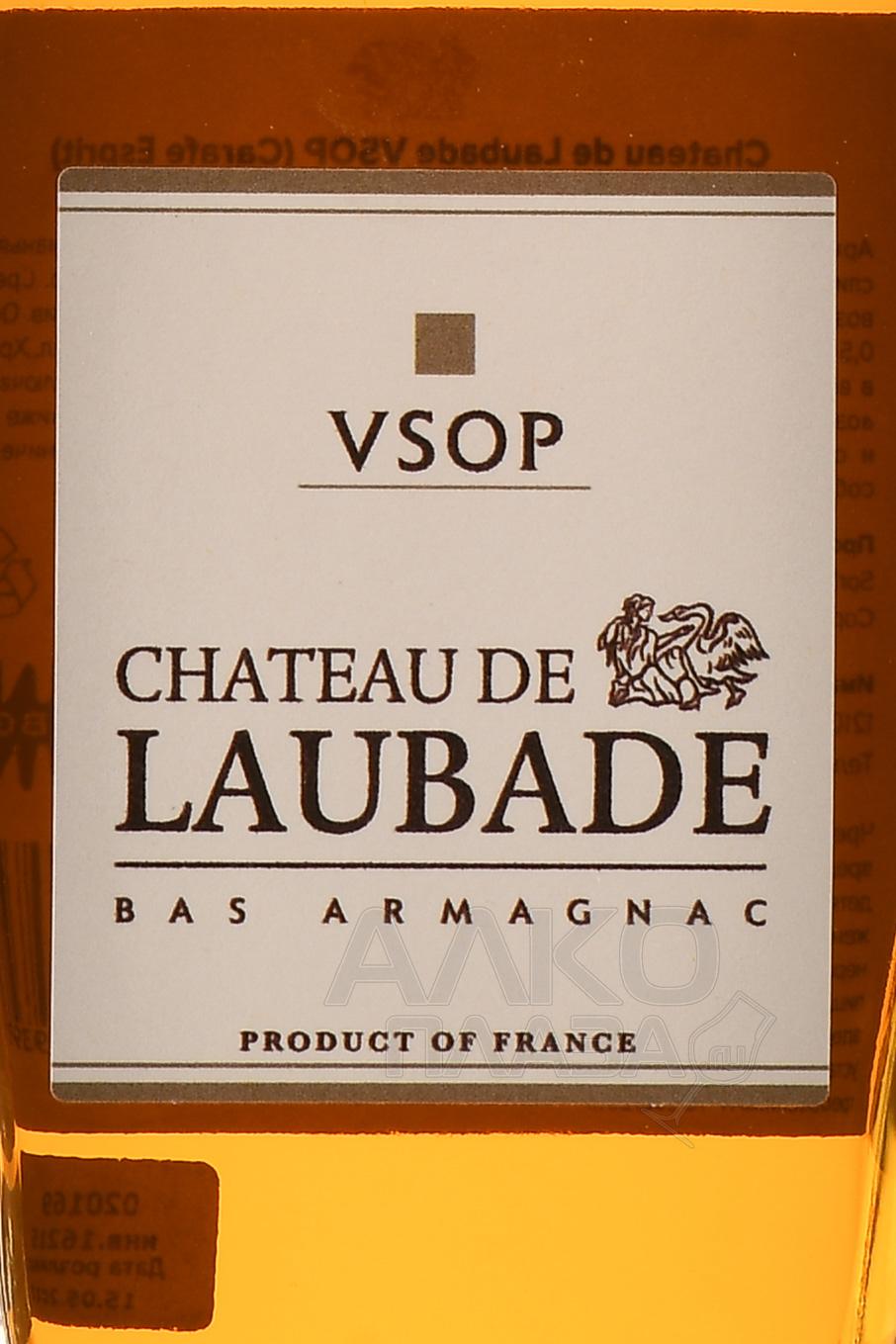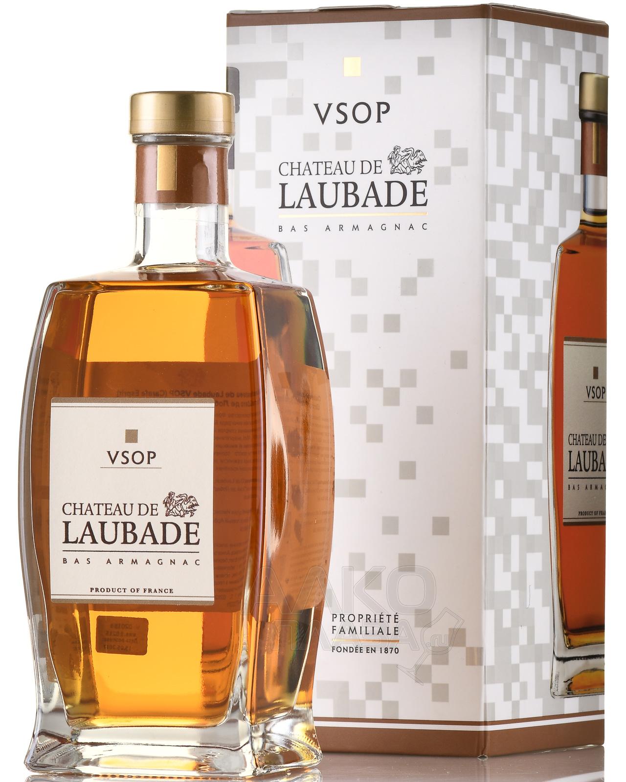Арманьяк Chateau de Laubade VSOP Carafe Esprit 0,5 л в п/у производится во Франции в регионе Гасконь, в зоне Ба-Арманьяк. Виноградники хозяйства расположены на песчано-глинистых почвах с высоким содержанием железа, известных как «sables fauves». Эти почвы обеспечивают мягкость и округлость будущего дистиллята. Климат — атлантический с тёплым летом и мягкой зимой, что способствует полноценному созреванию ягод. Винокурня осуществляет полный цикл производства на собственной территории. Вино для перегонки получают из традиционных сортов региона. Дистилляция проходит в непрерывных аламбиках шарантского типа. Спирты выдерживаются в бочках из гасконского дуба. Категория VSOP означает минимальную выдержку не менее четырёх лет, однако партии, входящие в состав бленда, проводят в дубе больше времени — не менее шести лет.