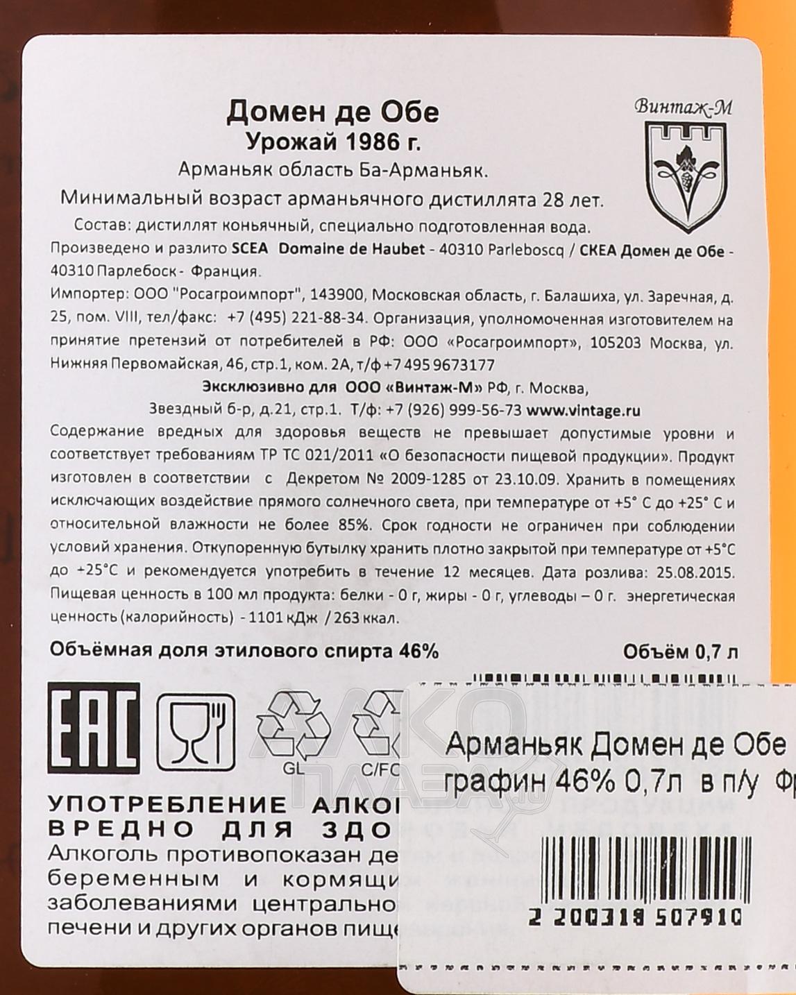 Арманьяк Domaine de Haubet 1986 г. 0,7 л в графине и п/у — элитный спиртной напиток, созданный в традициях французского винокурения региона Бас-Арманьяк. Его создали из популярных местных сортов винограда Уни Блан и Бако, выращенного на песчаных и глинисто-известняковых почвах с высоким содержанием железа. Территория виноградников домена расположена в западной части Гаскони, славящейся мягким океаническим климатом и устойчивыми температурными показателями. Год урожая 1986 выдался благоприятным: теплое лето, умеренные осадки и сухая осень позволили собрать виноград отличного качества с высоким содержанием сахаров и насыщенным вкусом. Винокурение производилось традиционным методом непрерывной однократной перегонки в медных кубах, после чего спирты выдерживали в дубовых бочках из гасконских лесов. Самые молодые дистилляты в купаже имеют возраст не менее 28 лет, благодаря чему бленд демонстрирует глубокий, изысканный и многогранный характер. Элегантный графин, упакованный в подарочную коробку подчеркивает премиальный статус напитка и его коллекционную ценность.