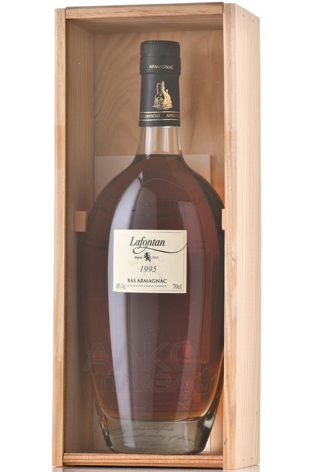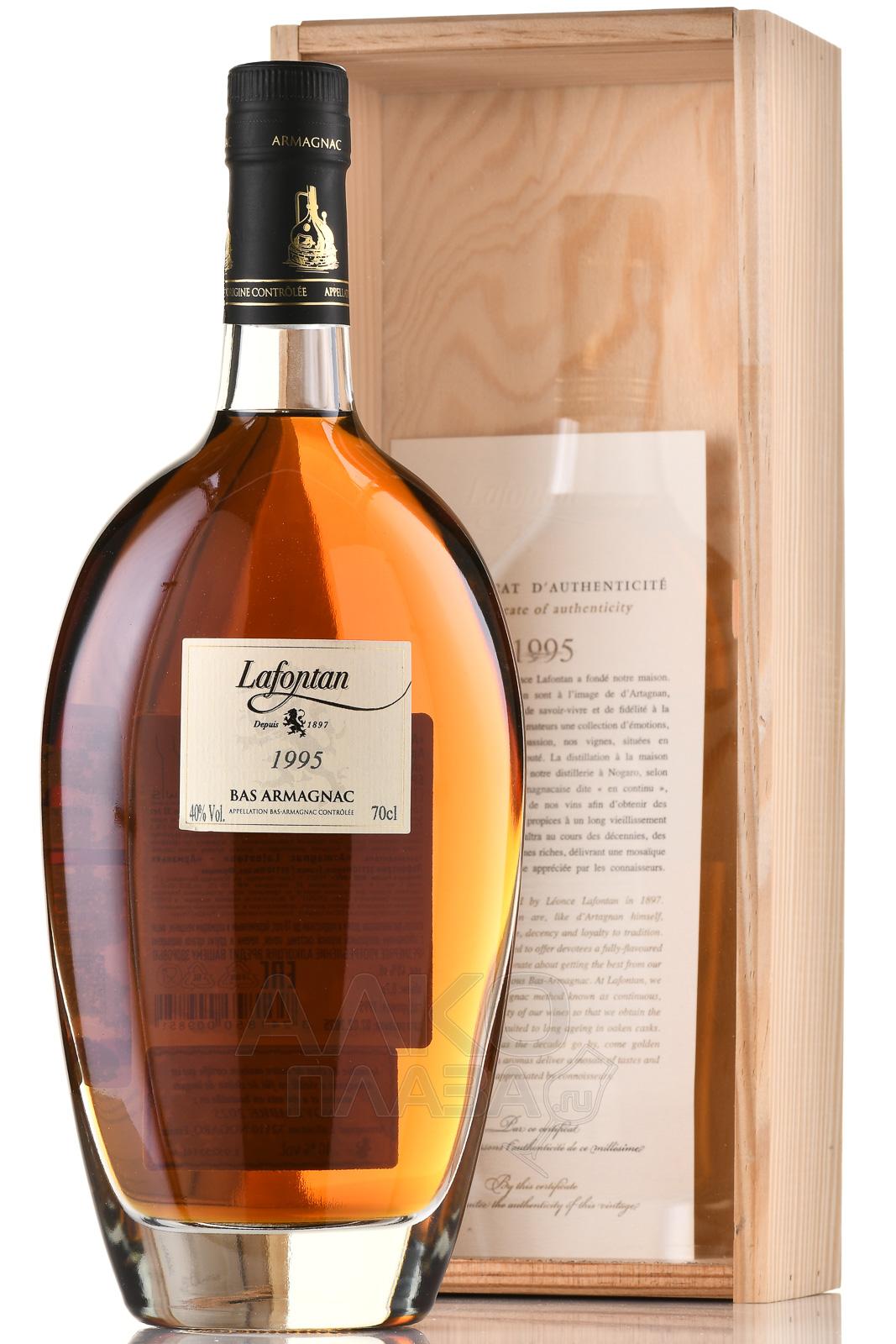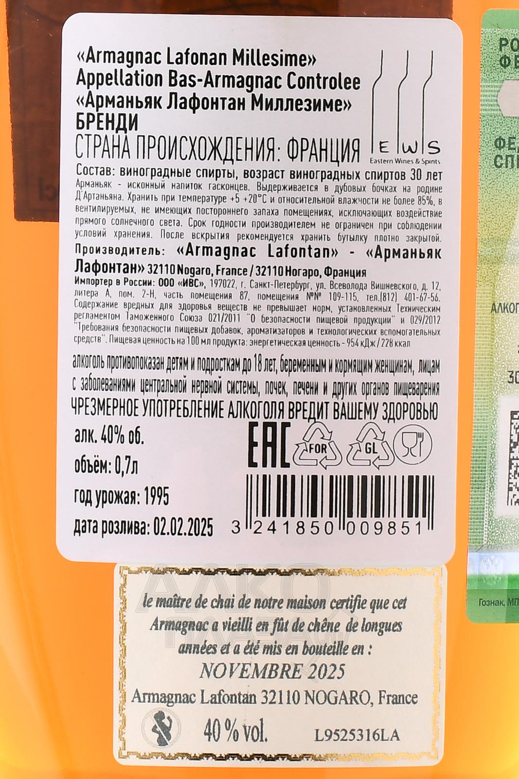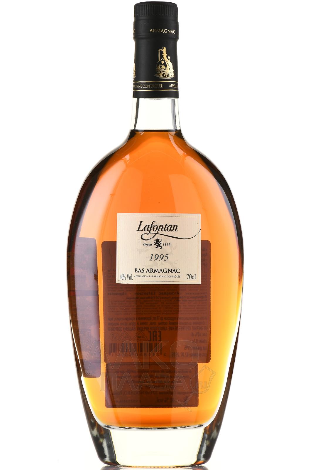 Арманьяк Lafontan Millesime 1995 года 0,7 л в д/у является прекрасным подарком для ценителя. Запоминающимся событием станет его вручение человеку, родившемуся в год урожая. Также миллезимный алкоголь можно вручить на годовщину свадьбы и по другому подобному поводу. Для изготовления использовались традиционные сорта, выращенные в зоне Bas-Armagnac AOC (Верхний Арманьяк). Виноград Бако отвечает за многогранную ароматику, Коломбар — за уникальную стилистику, Уни Блан — за гладкость текстуры, а Фоль Бланш — за свежие фруктовые ноты в букете. Дистилляты, тщательно отобранные для купажа, не менее 27 лет созревали в бочонках из черного гасконского дуба. Винтажный арманьяк, созданный на родине легендарного мушкетера Д`Артаньяна, обладает объемным и плотным профилем и не уступает коньякам.
