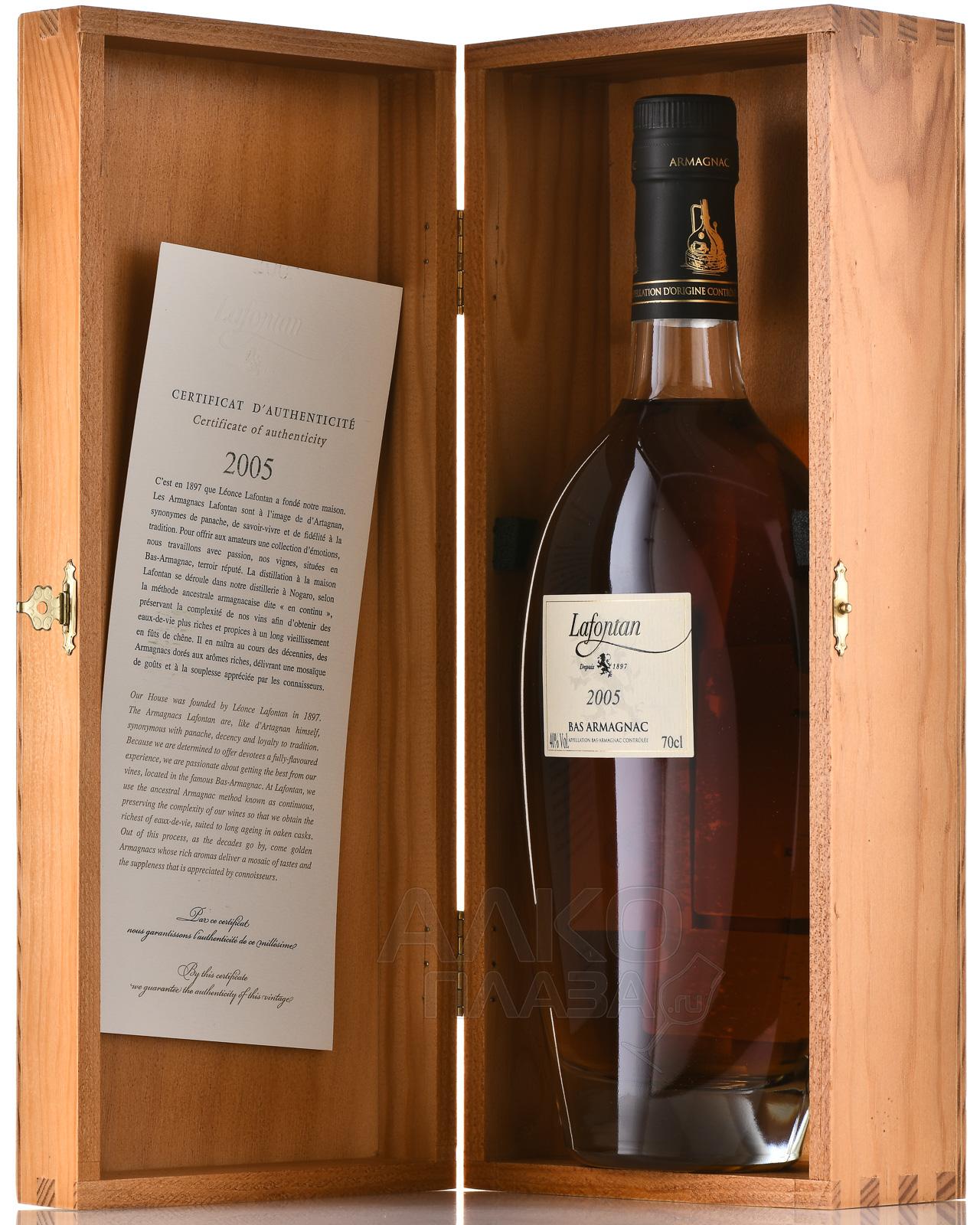 Арманьяк Lafontan Millesime 2005 г. 0,7 л в д/у — выдержанный винтажный образец из престижного субрегиона Гаскони. Произведён из винограда местных белых сортов. Плоды традиционно выращиваются на песчано-глинистых почвах. Сезон сбора сырья отличался мягкой весной с умеренными дождями и жарким сухим летом, обеспечившими полное созревание ягод. Особенность напитка — в использовании однократной перегонки в медных аламбиках и выдержке в дубовых бочках не менее 15 лет. Дистиллят не смешивался с другими урожаями, благодаря чему демонстрирует исключительно миллезимный характер.