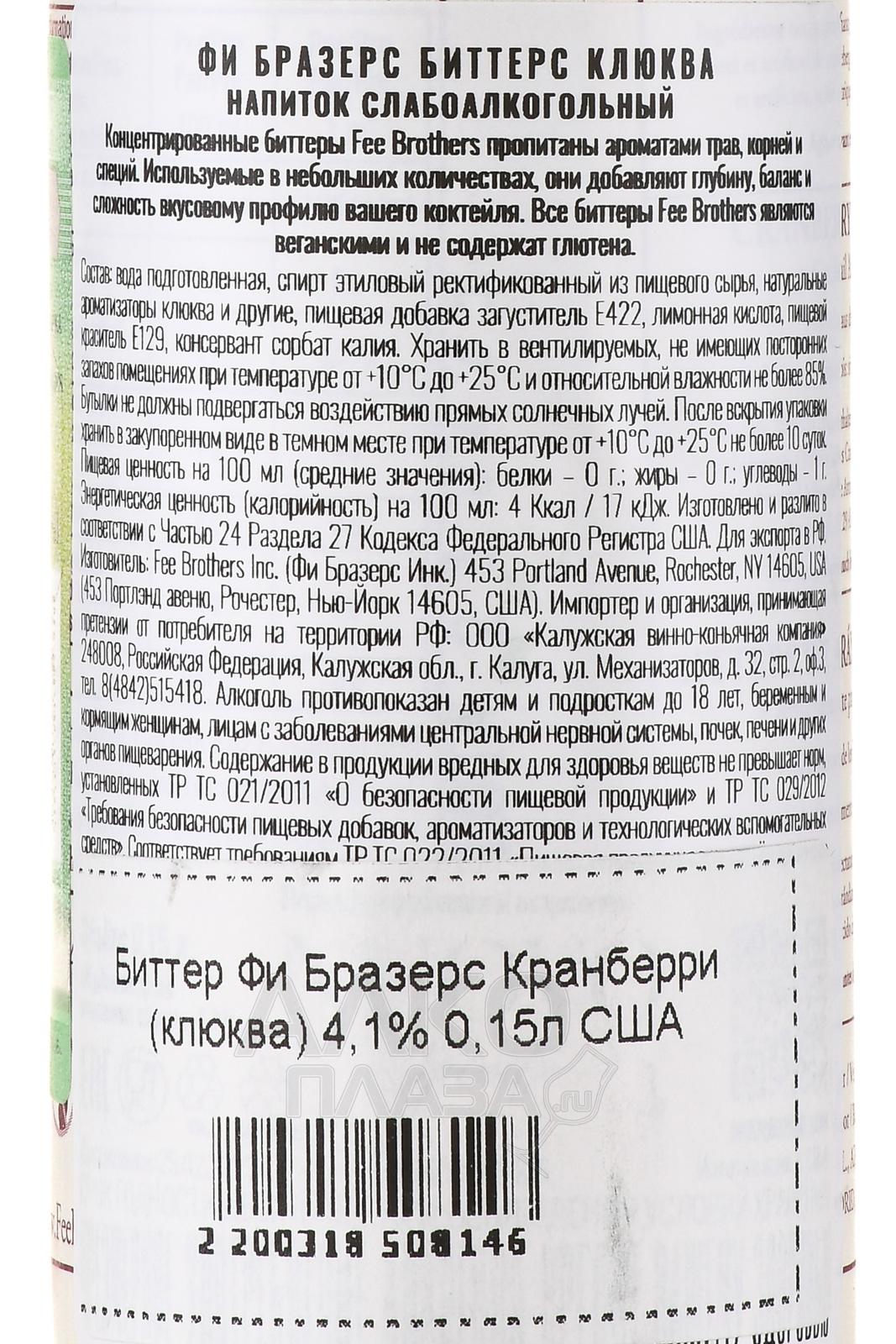 Биттер Fee Brothers Cranberry 0,15 л — это сбалансированная, фруктово-кислая версия классических горьких настоек. Производится американской компанией Фи Бразерс, основанной в 1864 году. Изготавливается методом мацерации ягод клюквы с использованием спиртовой основы и добавления натуральных ароматических ингредиентов. Уникальность биттера заключается в выразительном ягодном характере с мягкой терпкостью. Он выпускается с 2010 года и популярен среди профессиональных барменов. Входит в рекомендации авторитетных коктейльных гидов благодаря стабильному качеству.