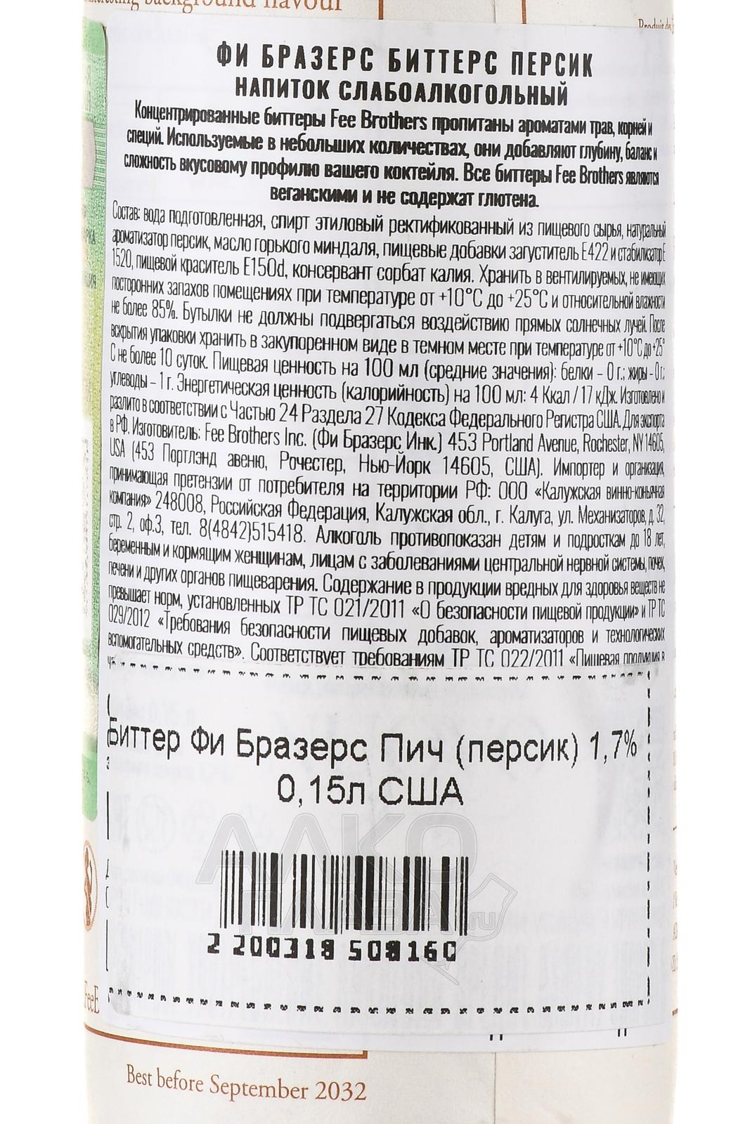 Биттер Fee Brothers Peach 0,15 л — ароматный фруктовый ликер американского производства с насыщенным персиковым характером. Выпускается компанией Фи Боазерс, известной традиционными технологиями настаивания. Особенность производства — медленная экстракция натуральных ингредиентов для максимального раскрытия аромата. Биттер востребован профессиональными барменами, регулярно получает высокие оценки экспертов и упоминается в рейтингах лучших фруктовых биттеров мира.