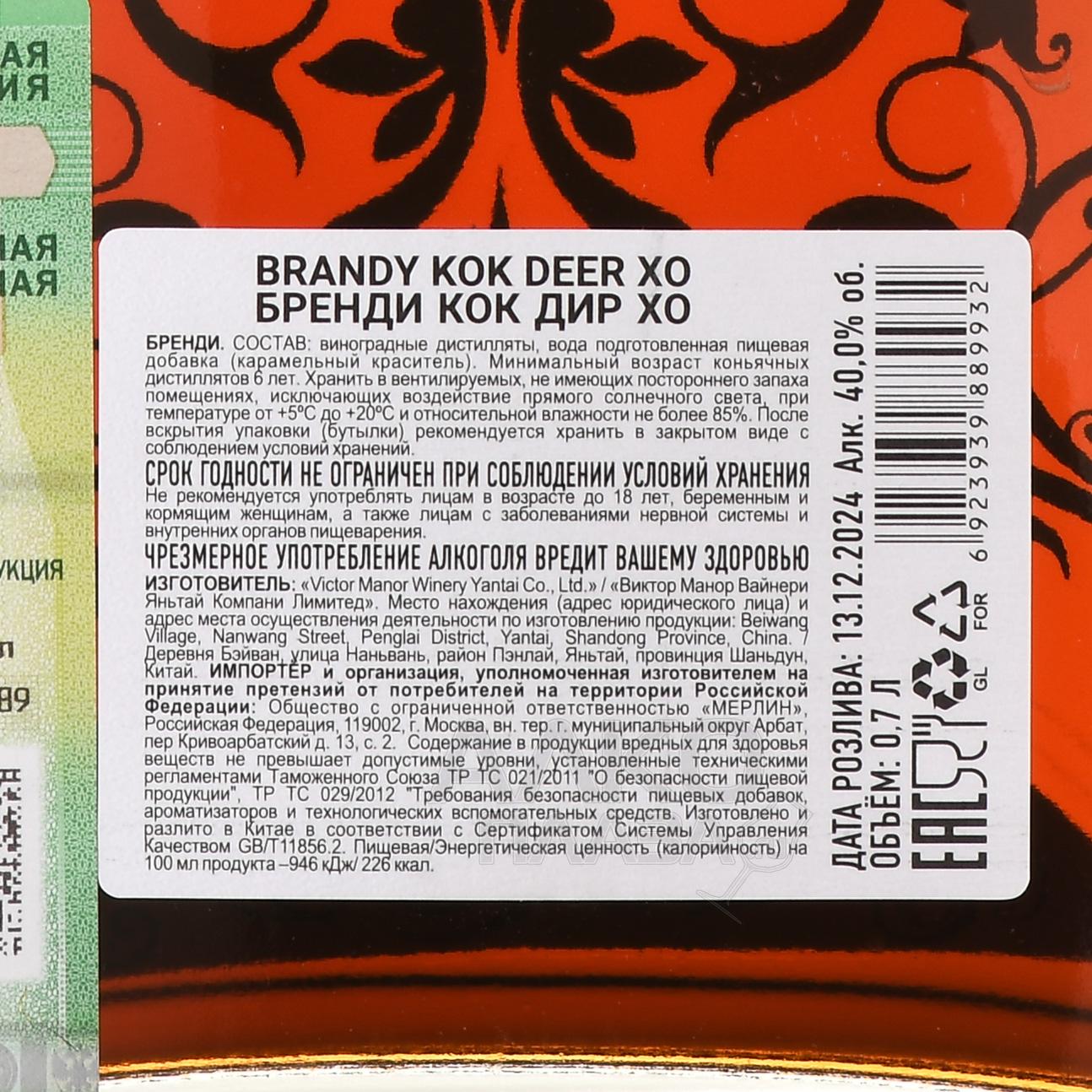 Бренди Kok Deer XO 0,7 л — китайский дистиллят, произведённый из винограда, выращенного в провинции Шаньдун. Регион характеризуется умеренным морским климатом с продолжительным вегетационным периодом, что способствует накоплению сахаров и развитию ароматических соединений в ягодах. Гравийные и песчаные почвы преимущественно, обогащённые минералами, обеспечивают оптимальные условия для виноградарства. Сбор урожая проводится вручную, с последующей ферментацией и двойной дистилляцией в медных аламбиках по традиционной технологии. Выдержка осуществляется в дубовых бочках в течение как минимум 6 лет.