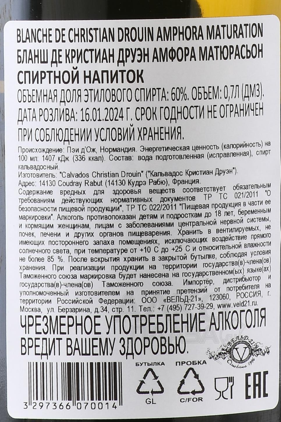 Кальвадос Christian Drouin Blanche de Amphora Maturation 0,7 л — редкий образец нормандского мастерства, воплощающий новую философию выдержки. Этот напиток создан в поместье, где высокоствольные яблоневые сады выращиваются органическими методами на холмах с глинисто-известковыми почвами и мягким морским климатом. Урожай собирают вручную, выбирая сорта с яркой кислотностью и ароматной сладостью, затем прессуют и сбраживают естественным образом. В производстве используется более 20 разновидностей яблок. Дистилляция проводится в традиционных медных аламбиках, что сохраняет фруктовую структуру и прозрачность вкуса. Главная особенность релиза — выдержка не в дубе, а в амфорах из обожженной глины. Такой метод исключает контакт с древесиной, сохраняя свежесть и чистоту яблочного дистиллята. Спиртное остается бесцветным, но приобретает исключительную глубину и минеральную выразительность. Это кальвадос нового поколения, объединяющий традицию и эксперимент.