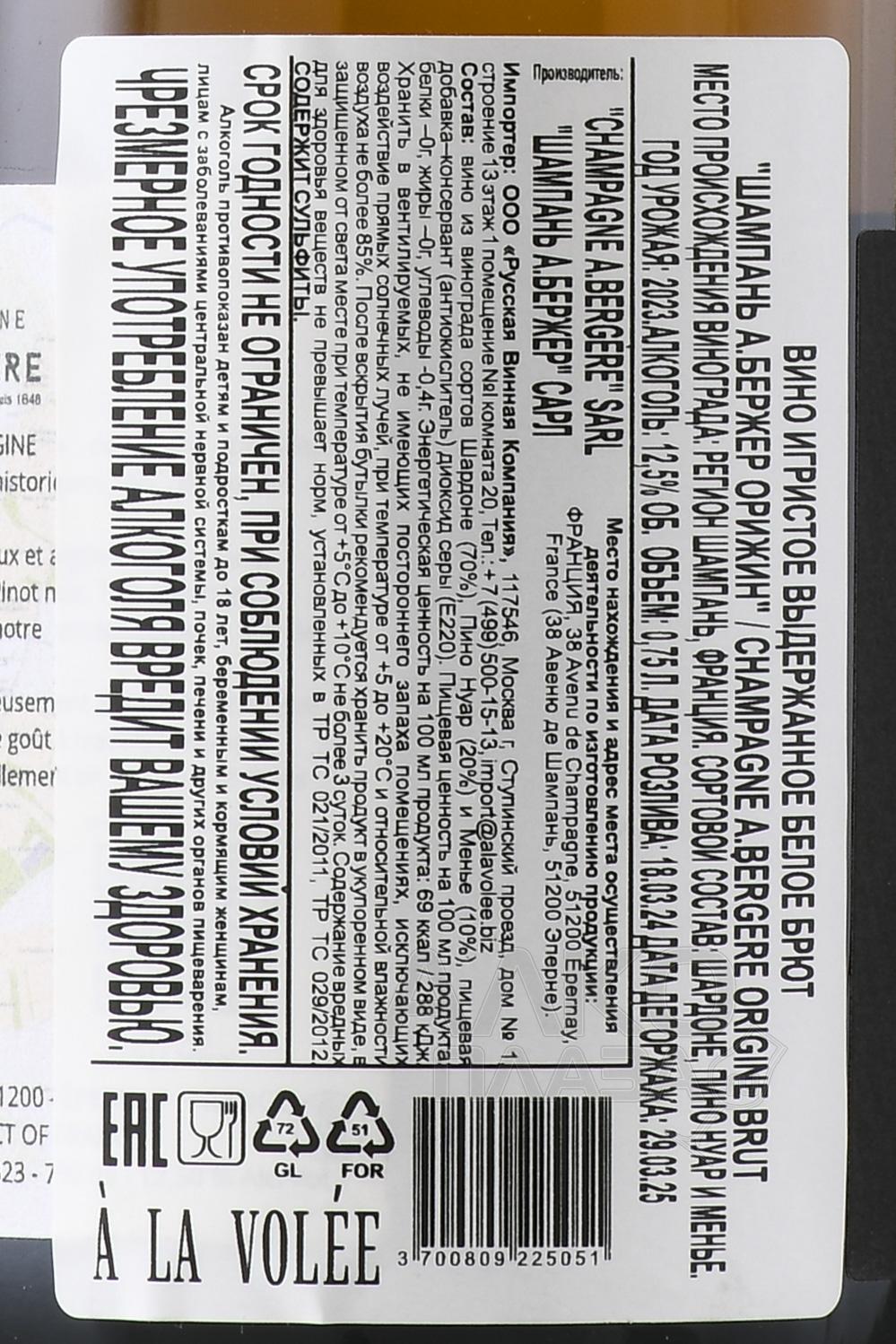Шампанское белое брют A. Bergere Origine 0,75 л производится в регионе Шампань из винограда, выращенного на характерных для местных терруаров известняковых и меловых почвах. Напиток создаётся традиционным методом вторичной ферментации в бутылке. Виноград собирают при оптимальной зрелости, после чего проводят мягкое прессование и отдельную винификацию базовых вин. Ферментация проходит с контролем температур, что позволяет сохранить свежесть и сортовую чистоту будущего купажа. Созревание на осадке формирует структуру и тонкую текстуру.