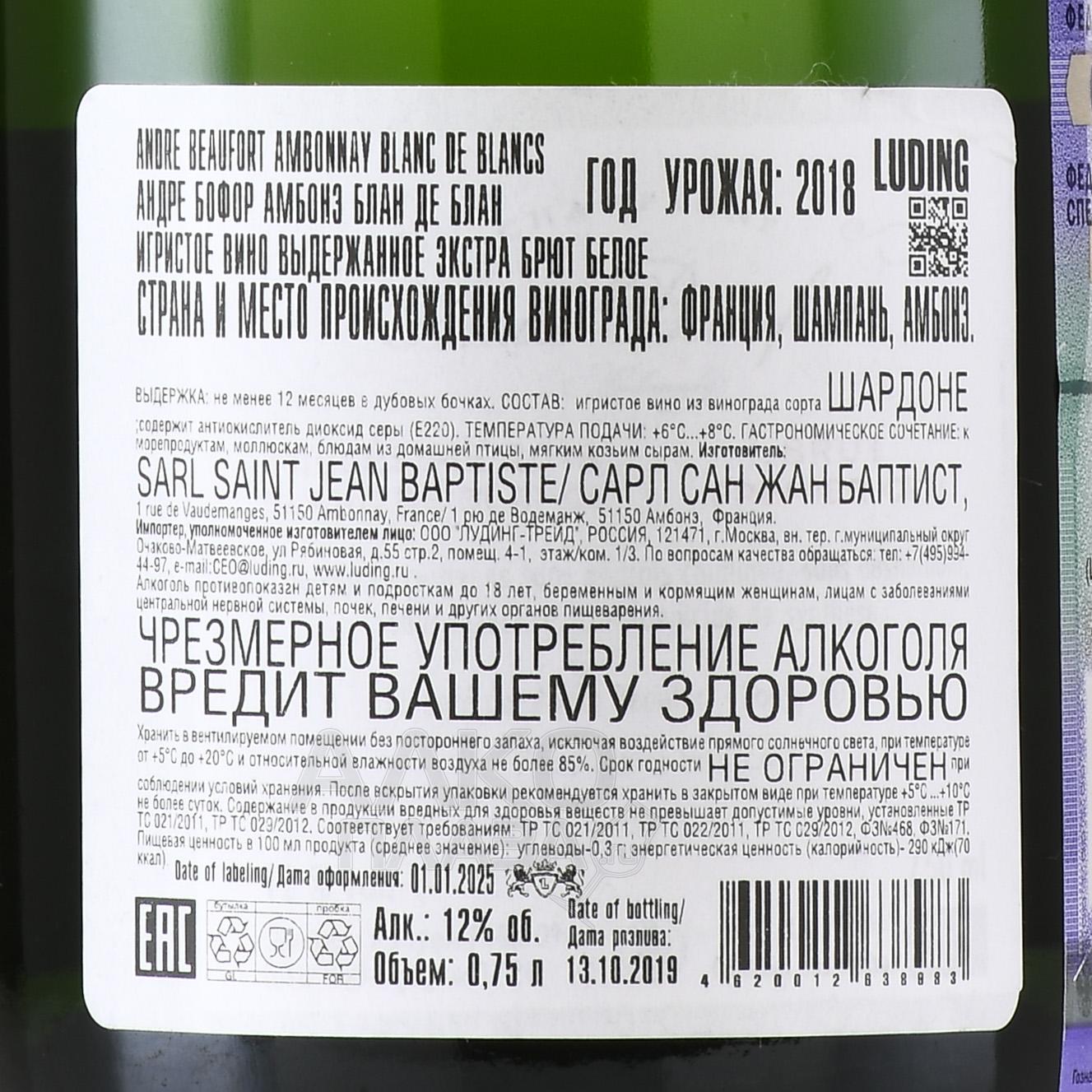 Шампанское Andre Beaufort Ambonnay Blanc de Blancs Premier Cru 0,75 л — изысканный белый брют из одного сорта, который выращивается в самом сердце провинции Шампань на меловых почвах. Процесс производства базируется на классической технологии. Игристое вино выдерживается в течение 22 месяцев. Оно получило много похвальных отзывов от критиков и ведущих специализированных изданий. Это элитное шампанское имеет потенциал хранения в бутылке 8-10 лет.