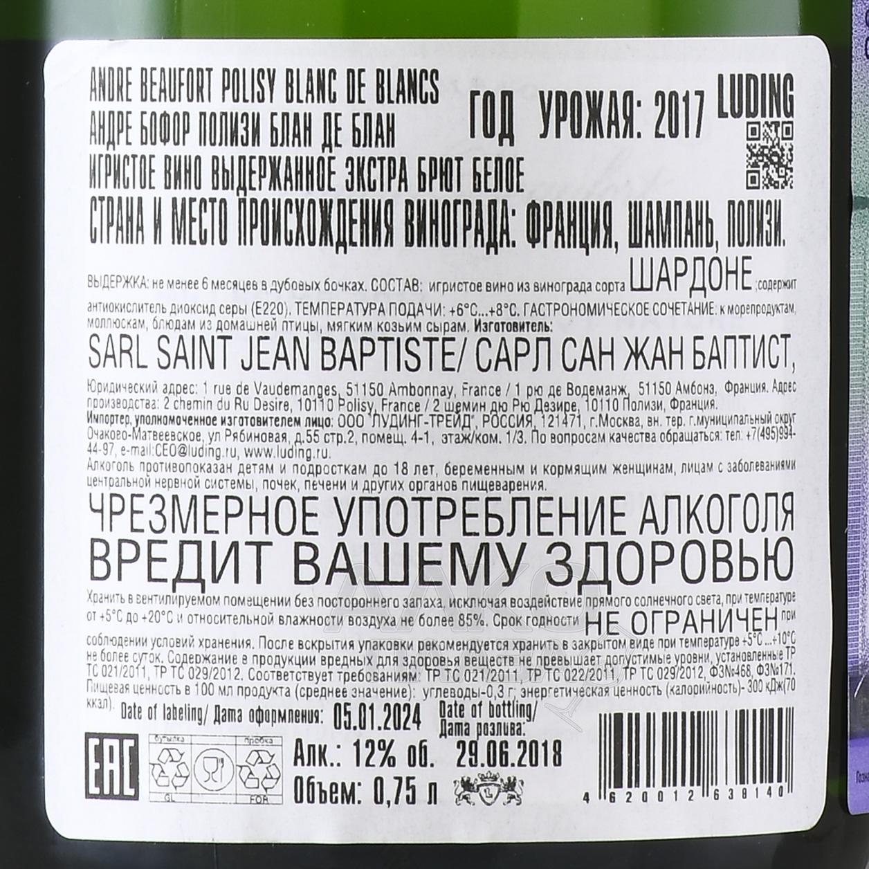 Шампанское Andre Beaufort Polisy Blanc de Blancs 0,75 л представляет собой белый брют натюр из одного светлого сорта, созданный по классической технологии Блан де блан - «белое из белого». Виноград поступает из коммуны Полизи, которая находится в субрегионе Кот-де-Бар. Старые лозы растут на меловых киммериджских почвах, сбор урожая производится вручную. Кюве ферментируют в стальных чанах на натуральных дрожжах и выдерживают в дубовых бочках в течение 10 месяцев, затем следует этап вторичного брожения в бутылках. Несколько лет шампанское дозревает в специально оборудованном подвале.