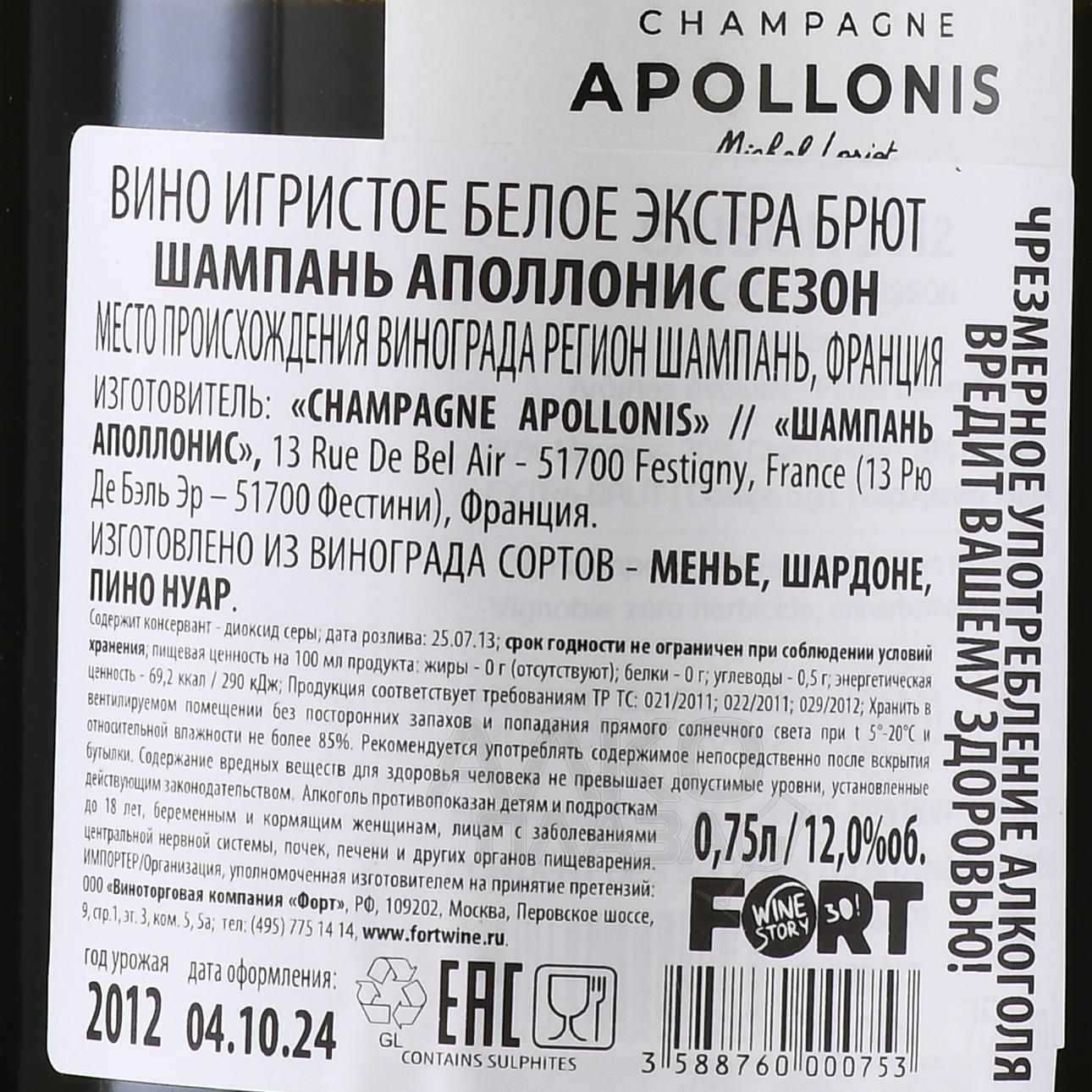Шампанское Apollonis Saison 2012 года 0,75 л в п/у создано в классическом стиле винодельни с выраженной минеральностью и гармонией. Виноград выращен на склонах в районе Кот де Блан, где меловые почвы придают напитку свежесть и долголетие. Урожай 2012 года считается удачным, ягоды дали концентрированный вкус при сохранении баланса кислотности. Первичная ферментация проходила в резервуарах из нержавеющей стали с контролем температуры. Вторичная ферментация и длительная выдержка на осадке во французских погребах обеспечили вину сложность и глубину. Уникальность этого шампанского подчеркивают высокие оценки винных критиков, которые выделяют его зрелость и чистоту стиля.