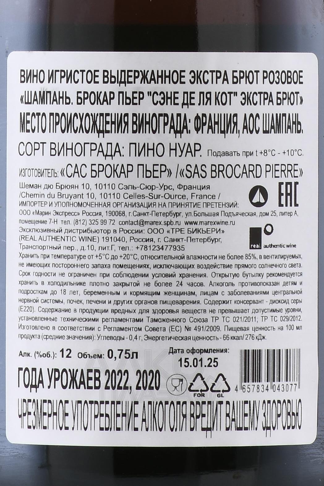 Розовое сухое шампанское Brocard Pierre Saignee de la Cote Extra Brut Champagne 2017 г. — винтажный 12-градусный брют в ассортименте семейной французской компании из региона Шампань, который контролируется по месту происхождения. Для его производства был использован красный виноград, выращенный в ограниченной зоне. Сырье подверглось кратковременной мацерации, ферментации в емкостях из нержавеющей стали и бутылках, а также выдержке на осадке.