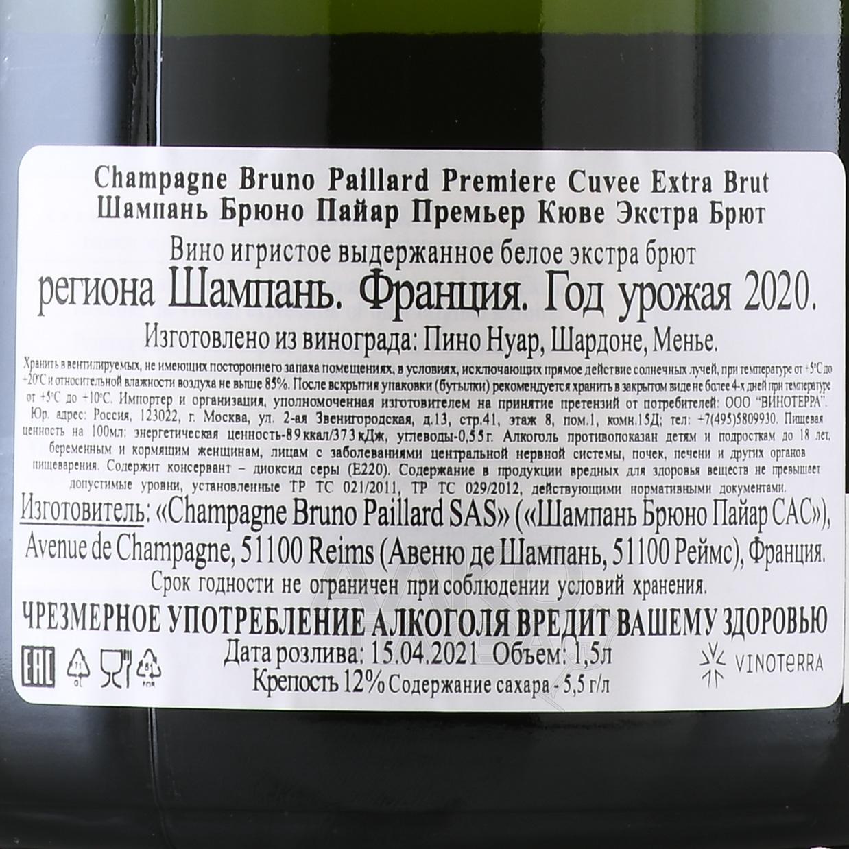 Шампанское Bruno Paillard Premiere Cuvee 1,5 л — изысканный белый брют с предельно низким содержанием сахара (не более 4 г на литр). Вариация в бутылке увеличенного объема, которая поставляется в подарочной коробке, как нельзя лучше подходит на роль солидного, статусного презента по особому поводу. Для создания напитка использовались 3 традиционных сорта. Сырье было получено с 30 участков из лучших терруаров Шампани. В состав добавляется до 50% резервного вина. Премиальное шампанское производится из высококачественного кюве и выдерживается минимум 3 года на тонком осадке. После дегоржажа оно дозревает в бутылках еще около 5 месяцев.