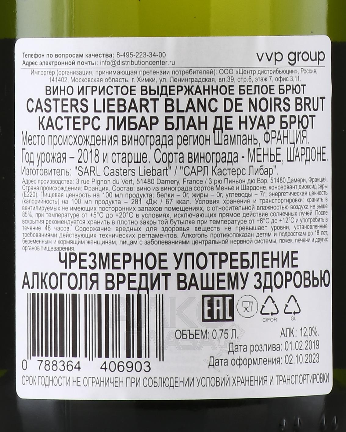 Шампанское белое брют Casters Liebart Blanc de Noirs Brut 0,75 л создаётся в Монтань-де-Реймс, где компания выращивает виноград на склонах с преобладанием мела, мергеля и песчаных включений. Рельеф — холмистый, высота участков превышает 200 метров над уровнем моря. Климат — прохладный, но солнечный, что помогает ягодам накапливать кислотность и сохранять сортовую выразительность. Для Блан де Нуар используют только красный виноград со старых лоз. Ручной сбор проводят в начале осени. Плоды прессуют аккуратно, чтобы получить прозрачный сок без окраски. Первичная ферментация проходит в стали при низкой температуре, затем партия проходит вторичное брожение в бутылке, сахар в составе дозажного ликера добавляется в минимальном количестве. Выдержка на осадке занимает не менее 24 месяцев.
