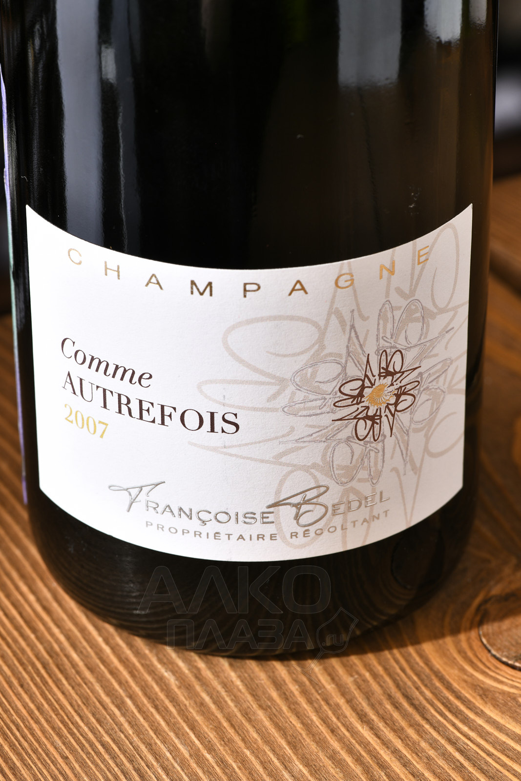 Шампанское Champagne Francoise Bedel Comme Autrefois Extra Brut 2005 г — экстрасухой французский напиток суперпремиальной категории, местностью происхождения которого является французская Долина Марны в регионе Шампань. Белое шипучее вино с уровнем крепости 12,5% является винтажным, поскольку создано из ягод трех сортов с преобладающим виноградом Пино Нуар, собранных вручную в 2005 году с известняковых почв. Средний возраст лоз — 25-60 лет. После обработки по технологии champenoise шампанское подвергли длительной выдержке на осадке (13 лет).