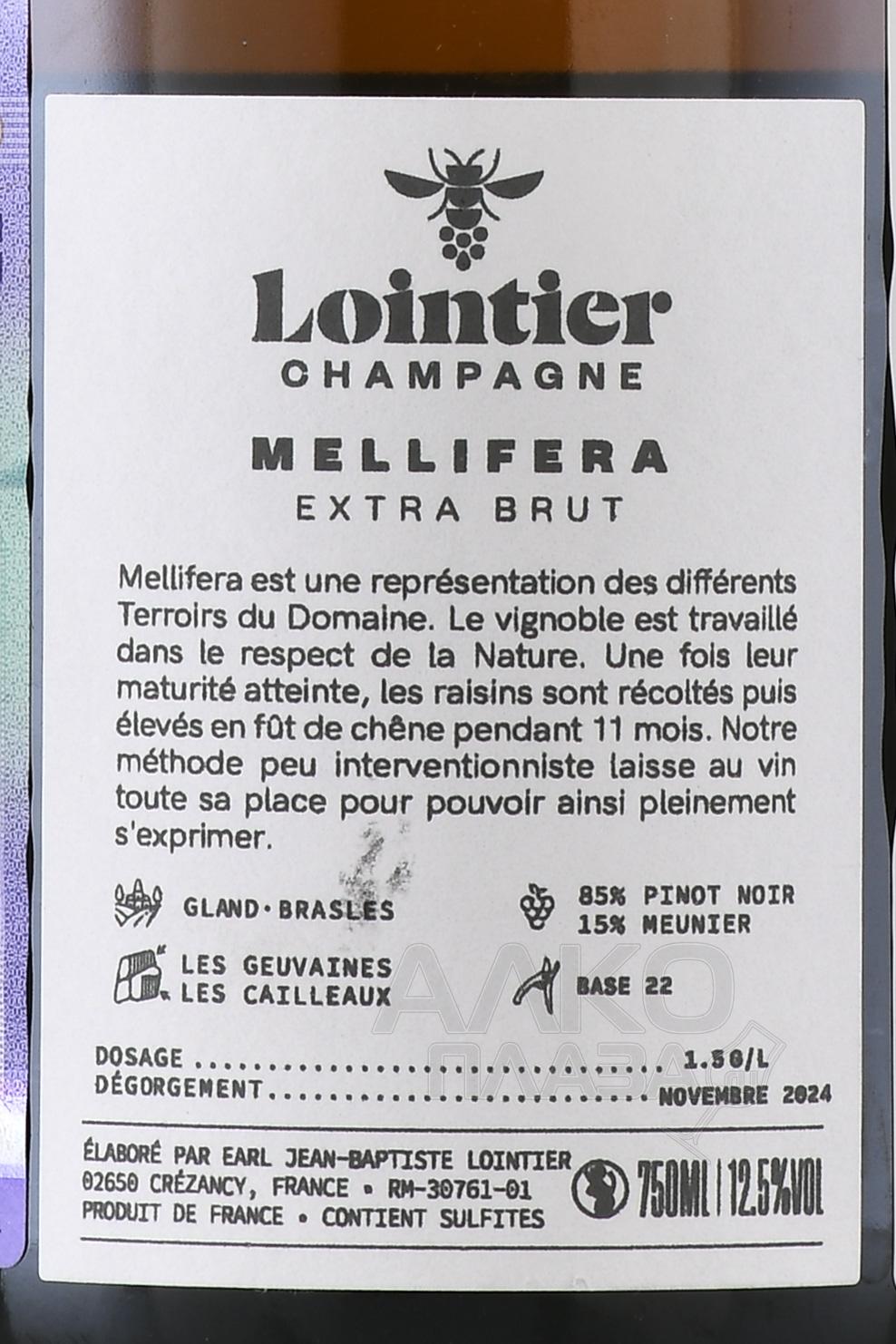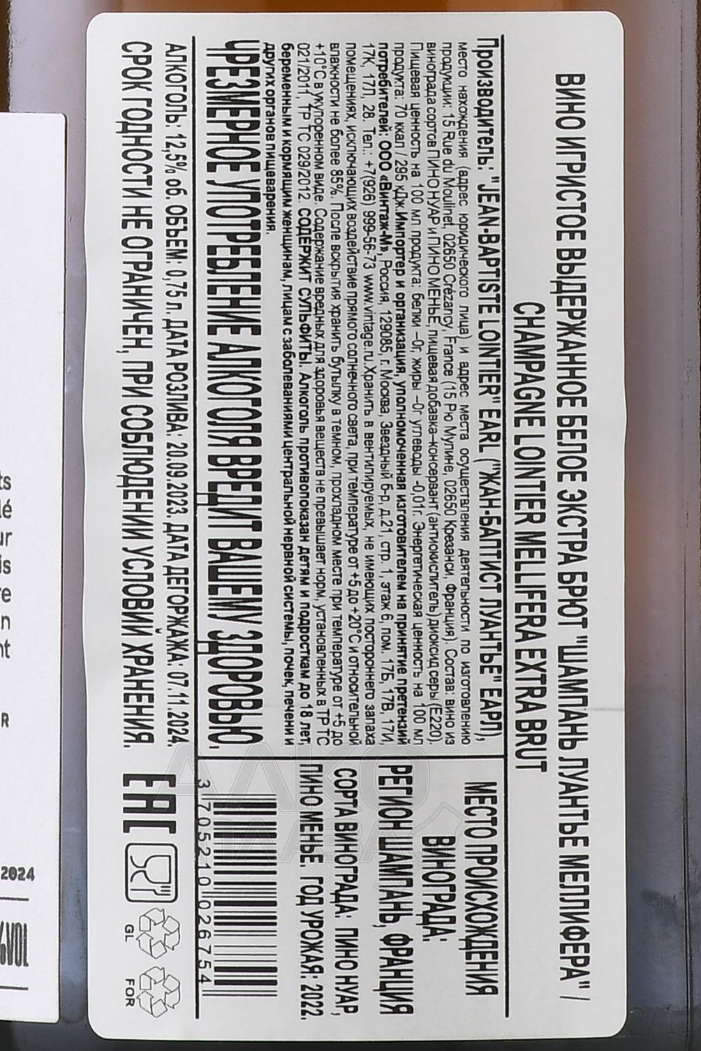 Белое шампанское экстра-брют Champagne Lointier Mellifera 0,75 л создается в историческом регионе Шампань, где виноградники расположены на меловых склонах с отличным дренажем. Название Меллифера отсылает к пчелам и флоре, окружающей лозы, что подчеркивает природный характер вина. Урожай собирается вручную, чтобы сохранить целостность ягод. Производитель использует классический метод шампанизации с длительным выдерживанием на осадке в бутылках, что формирует сложную структуру и минеральную основу напитка. Виноград выращен в условиях умеренного климата с прохладным летом и мягкой зимой, что позволяет сохранить кислотность и свежесть. Содержание сахара минимальное, поэтому вкус максимально сухой, с акцентом на чистоту и натуральность.