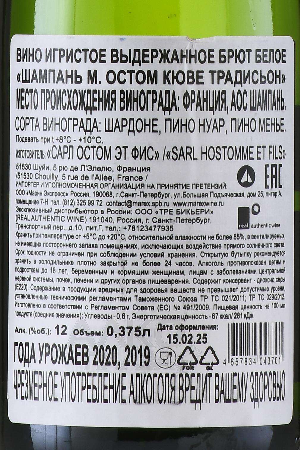 Шампанское белое брют Champagne M. Hostomme Cuvee Tradition 0,75 л создано на основе классического метода, когда вторичное брожение проходит в бутылке. Винодельня расположена в Кот-де-Блан — регионе, известном меловыми почвами, которые придают напиткам свежесть и минеральный характер. Урожай собирается вручную, что позволяет тщательно отбирать гроздья. В холодные годы купаж получается с более выраженной кислотностью, в теплые – с округлым вкусом и богатым ароматом. Баланс стиля достигается путем использования вин разных винтажей. В выдержке на осадке бленд проводит не менее 24 месяцев, что обогащает его структуру и усиливает букет.