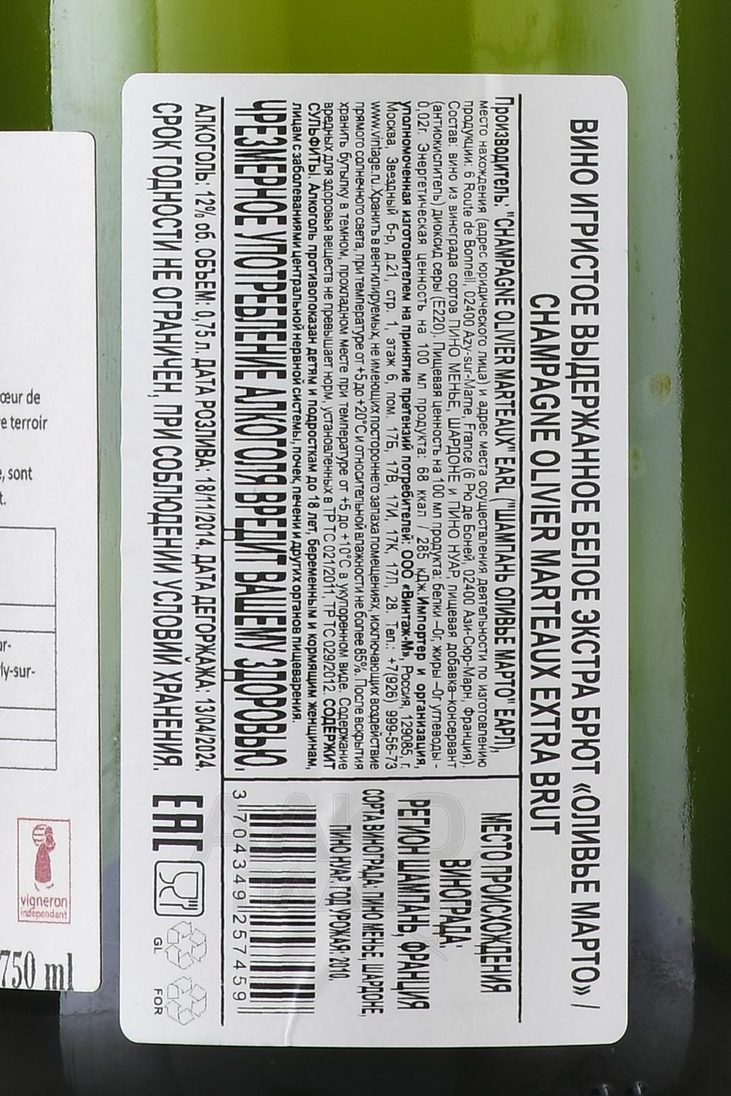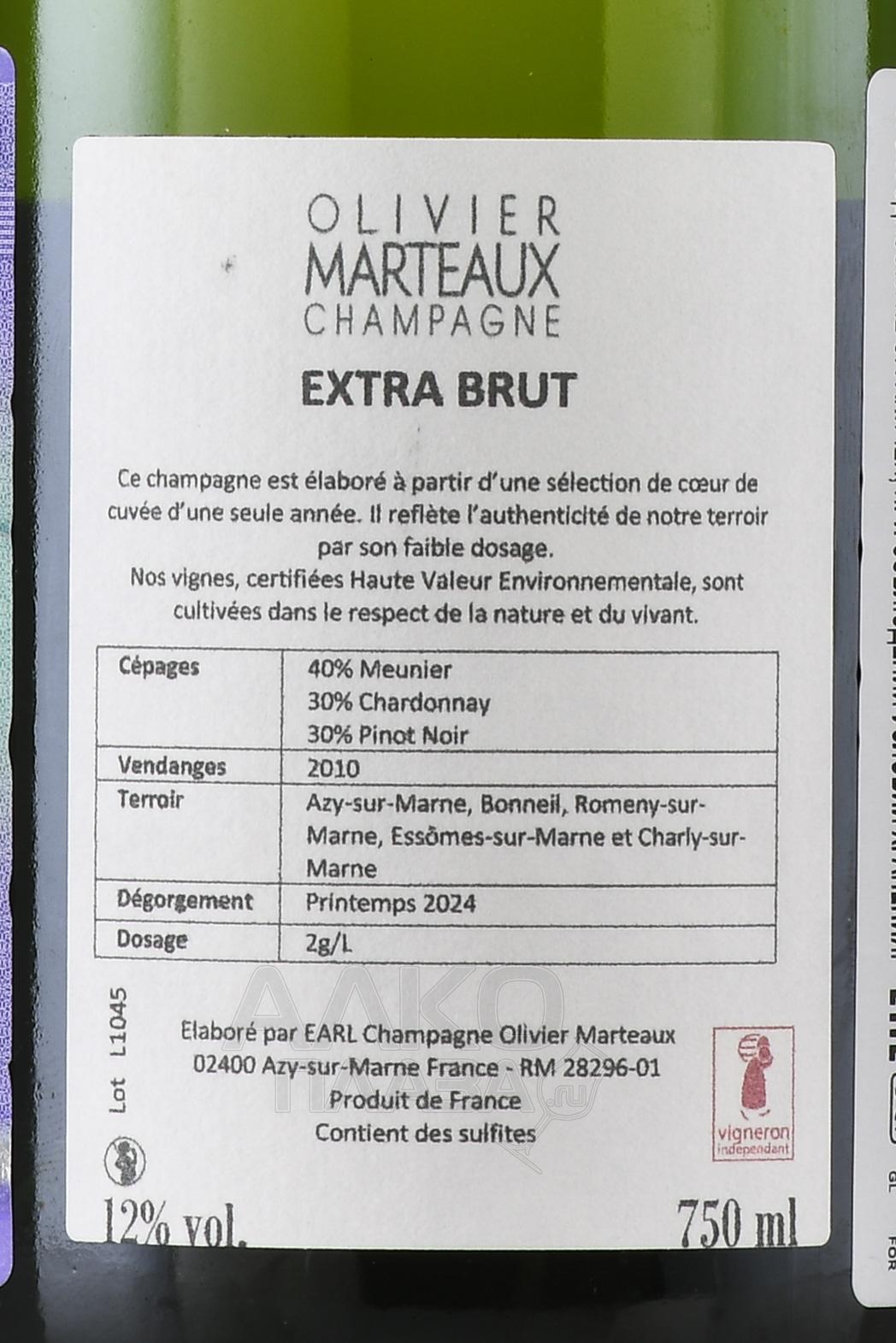 Шампанское белое экстра-брют Champagne Olivier Marteaux 0,75 л создается в деревне Аи, расположенной в историческом сердце региона Монтань де Реймс. Здесь лозы растут на меловых и известняковых почвах, которые обеспечивают баланс кислотности и минеральности. Семейное хозяйство, основанное в начале XX века, ведет виноградарство с акцентом на устойчивые методы и минимальное вмешательство. Урожай для этого кюве собирают вручную, затем проводят традиционное прессование и выдержку в погребах не менее 24 месяцев. Экстра-брют означает, что сусло почти не подслащено (концентрация сахара в составе дозажного ликера составила 2 г/л), поэтому вкус его сохраняет естественную свежесть. Винодельня использует собственные резервы вин для купажа, что придает стабильность и индивидуальный стиль каждому выпуску.