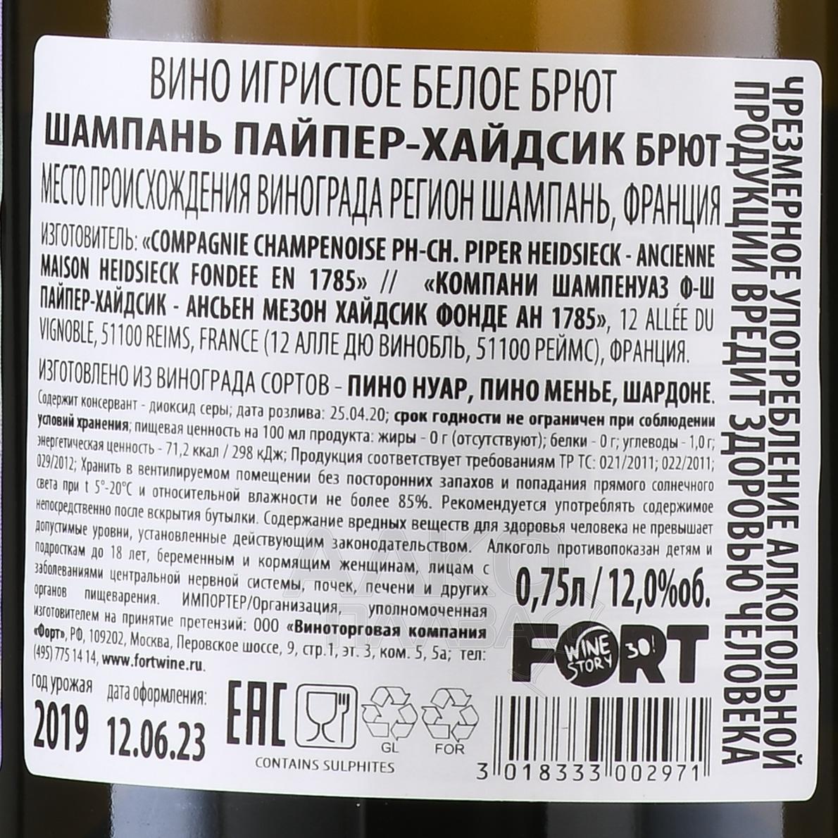 Champagne Piper-Heidsieck Brut - шампанское Шампань Пайпер-Хайдсик Брют 2019 год 0.75 л белое брют в п/у Помада