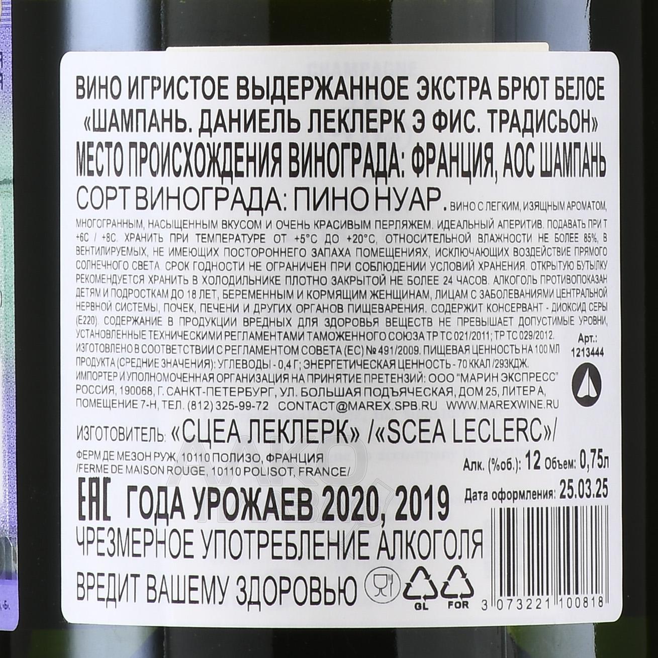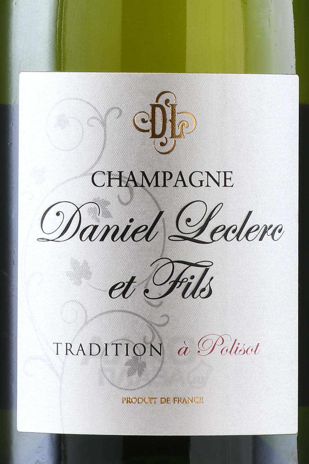 Шампанское белое экстра-брют Daniel Leclerc & Fils Tradition 0,75 л производится семейным хозяйством, расположенным в коммуне Полизо на юге зоны Бар-сюр-Сен в пределах Кот-де-Бар. Виноградники здесь растут на известково-глинистых почвах с выраженным киммериджским субстратом, что типично для южной части Шампани. Кюве относится к стилю blanc de noirs и создаётся исключительно из красного бургундского винограда. В основе ассамбляжа лежит базовый урожай с добавлением вин нескольких предыдущих лет. Стиль Extra Brut подчёркивает природную структуру напитка без акцента на дозаж. Винификация направлена на сохранение сдержанного характера, а выдержка на осадке формирует мягкую текстуру и цельный образ.