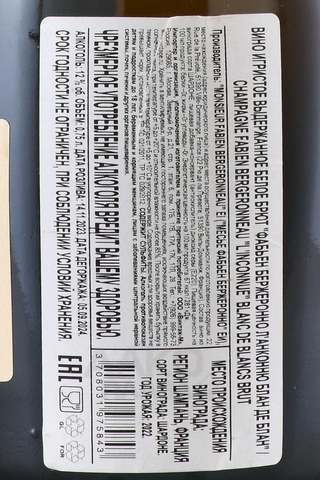 Fabien Bergeronneau L’Inconnue Blanc de Blancs - шампанское Фабьен Бержеронно Л’Анконню Блан де Блан 0.75 л белое брют натюр