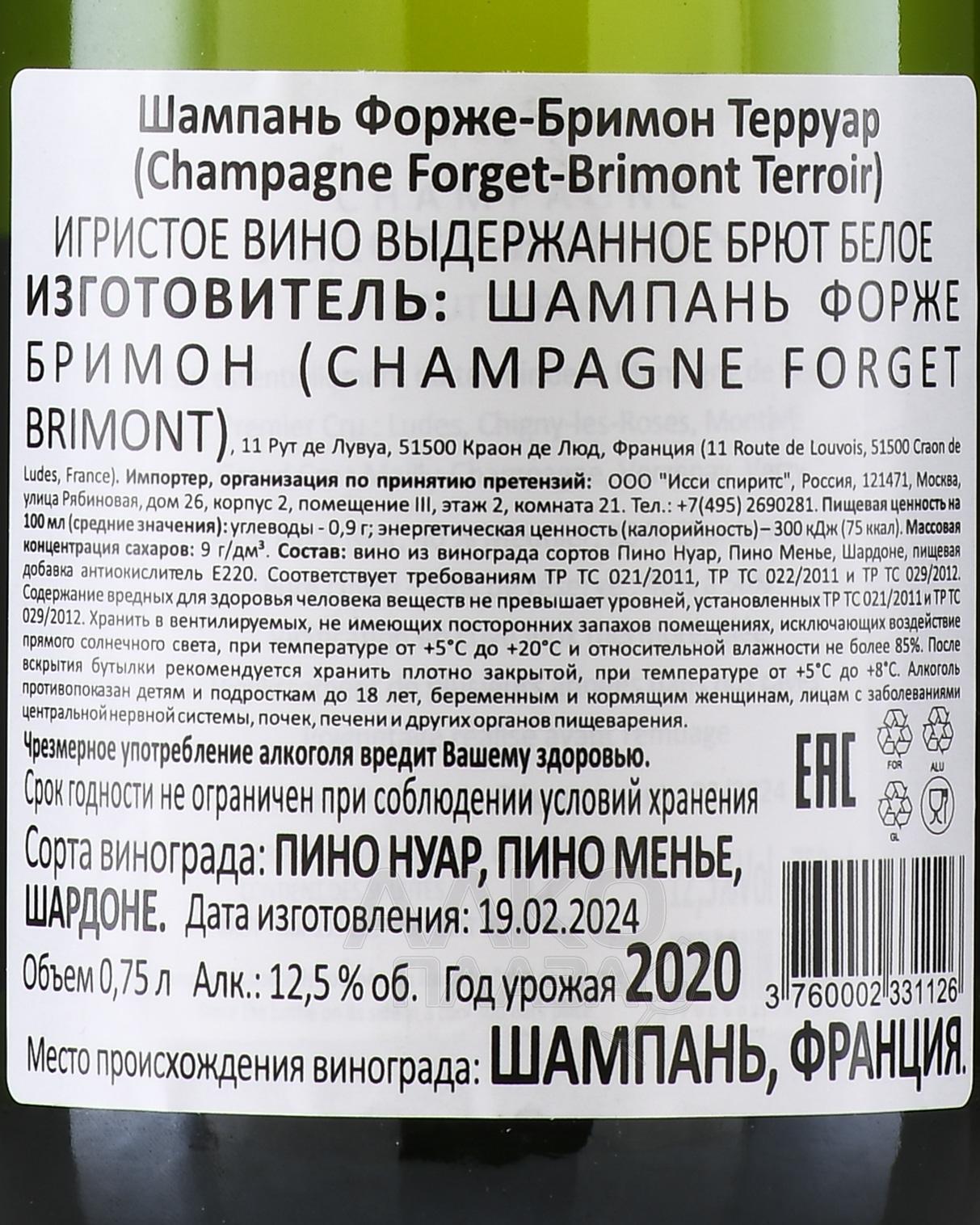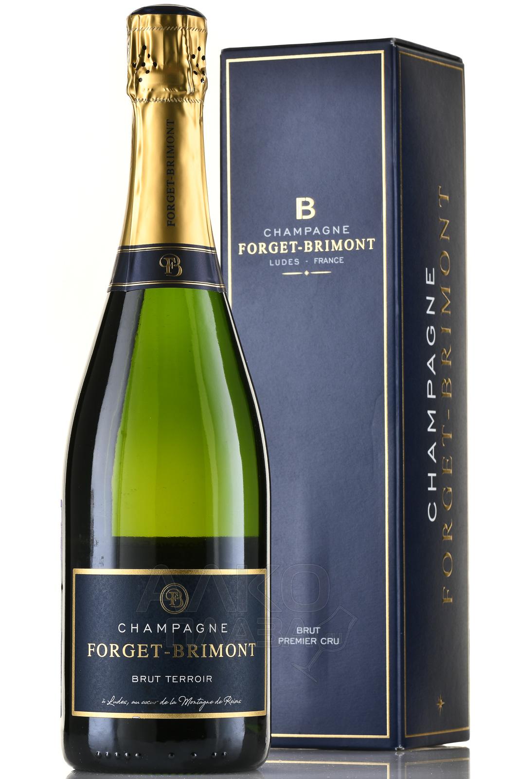 Белое сухое шампанское Forget-Brimont Brut Terroir Champagne 0,75 л — изысканный французский брют с традиционным составом из распространенного в Шампани винограда красных и белых сортов с плантаций классификации Премьер Крю. Изготовление выполнили на семейном заводе по методике бутылочной шампанизации. Выдержка на осадке длилась два с половиной года. В шампанском содержится до сорока процентов резервного вина. Высокое качество брюта было по достоинству оценено экспертами международных конкурсов «International Wine & Spirit Competition» и «International Wine Challenge», где в разные годы ему присуждали серебряные и бронзовые медали.