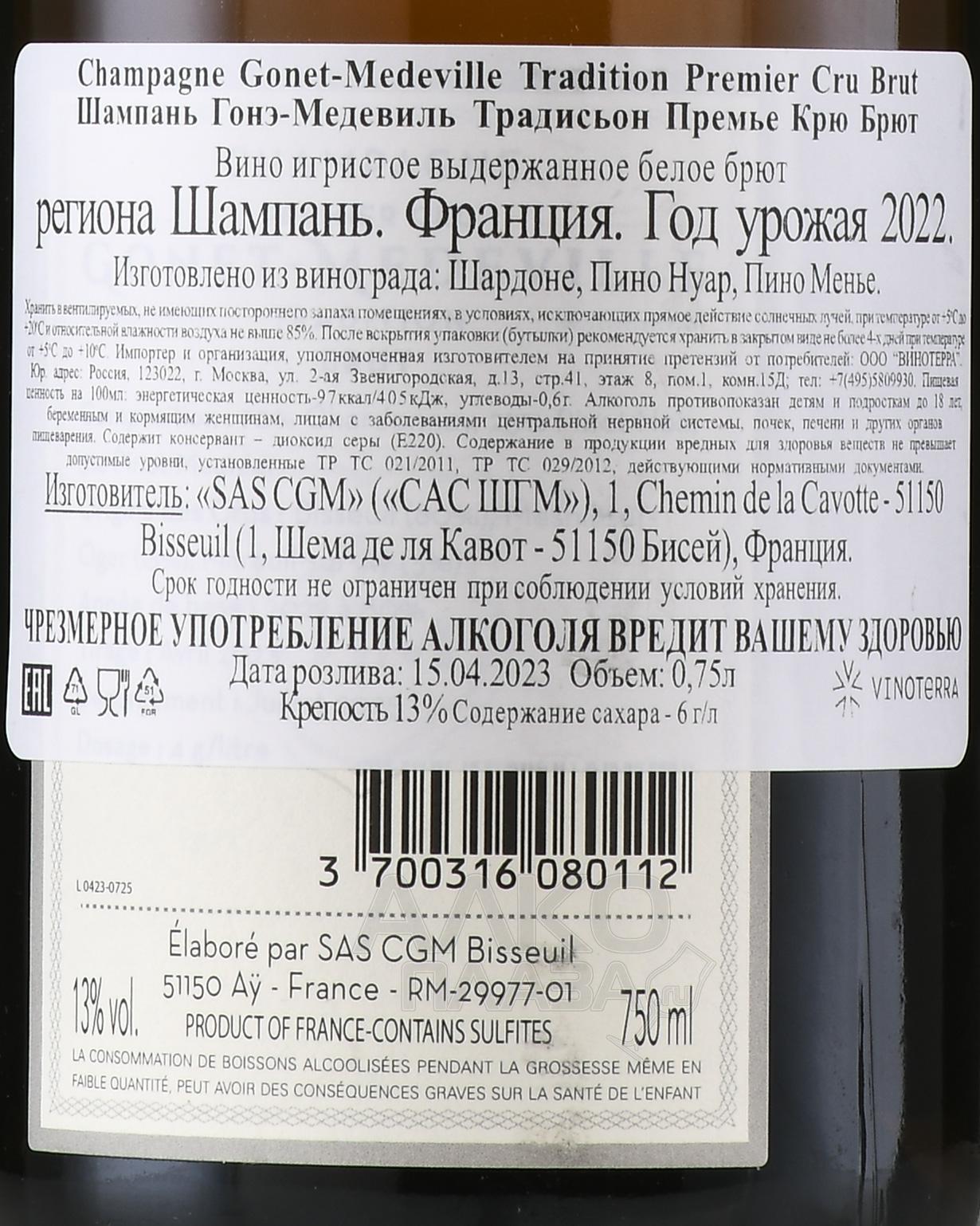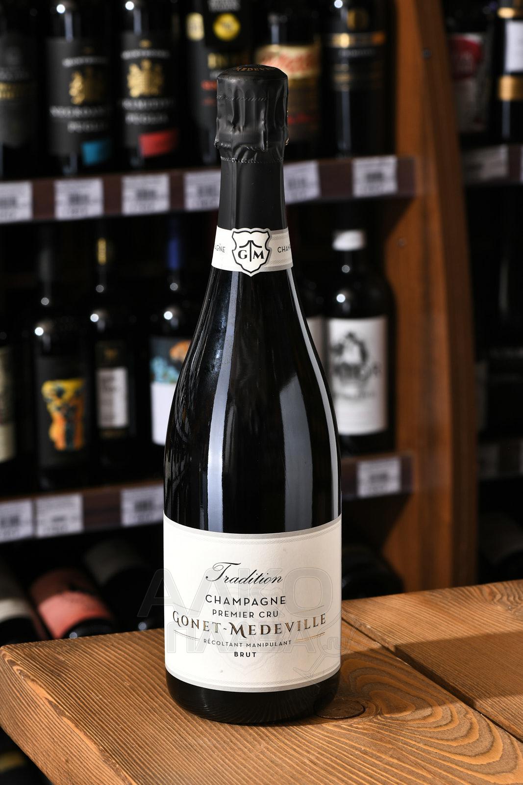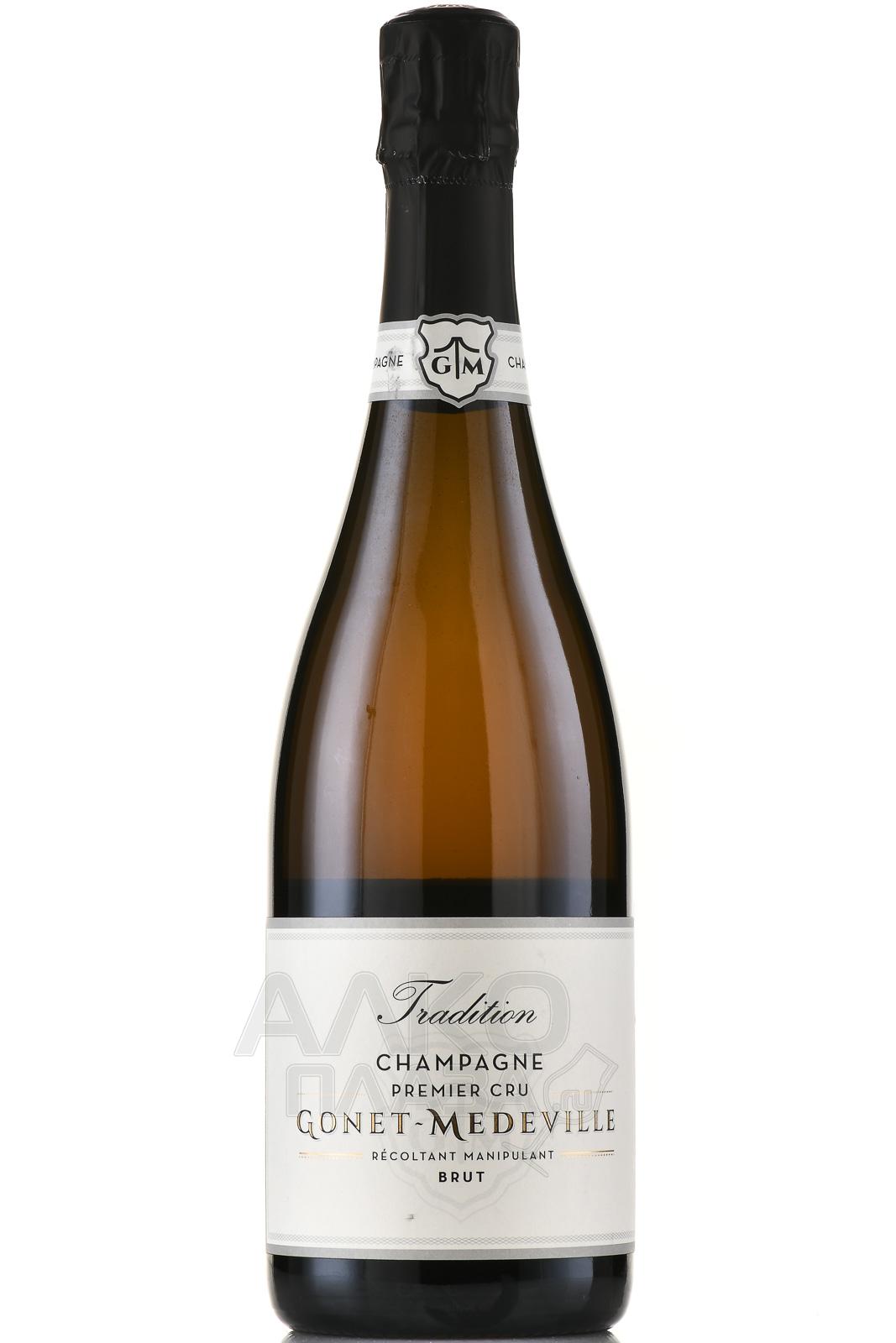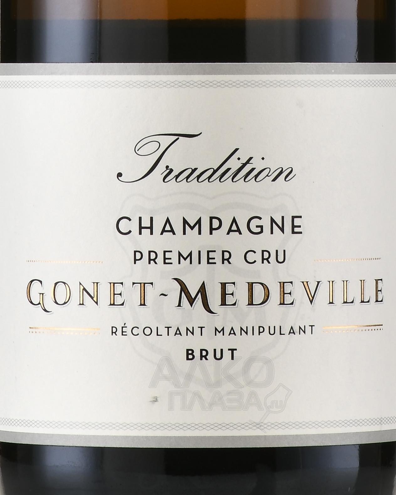 Белое сухое шампанское Gonet-Medeville Brut Tradition Premier Cru 0,75 л — традиционная разновидность брюта, которая обладает сбалансированным составом из распространенных в Шампани двух красных и одного белого сортов винограда. Процедура сбора урожая осуществилась с применением деликатного ручного труда. Большая часть сусла сбраживалась в стальных баках с постоянной температурной регулировкой, а остальное налили в бочки солидного возраста. Дальнейшая ферментация прошла уже в бутылках, где брют также выдерживался на осадке до двух лет. Его отправили на продажу не раньше, чем через четыре месяца после проведения дегоржажа.