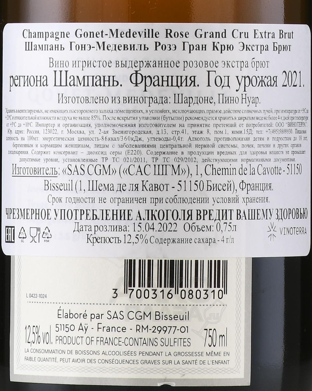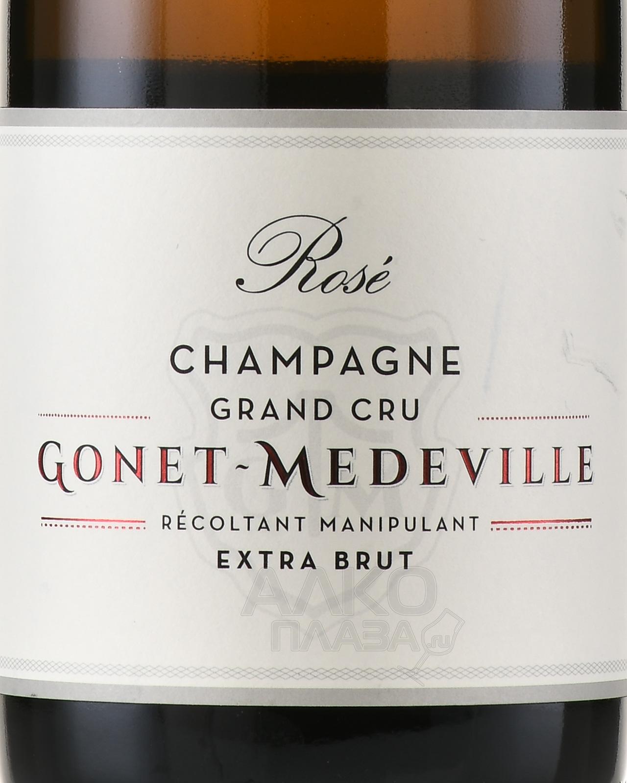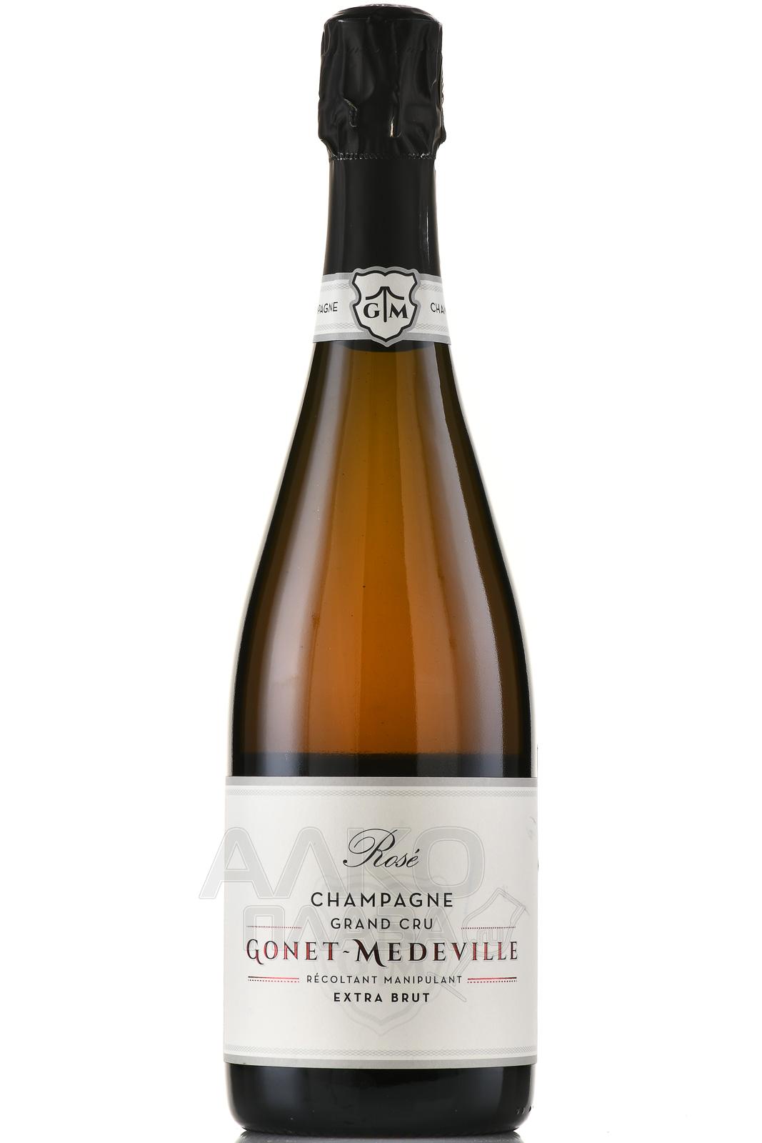 Розовое сухое шампанское Gonet-Medeville Extra Brut Rose Grand Cru 0,75 л предлагается французским хозяйством, которое было основано в Шампани в начале 2000-х годов. Состав напитка образуют традиционные сорта, выращенные на виноградниках классификации Гран Крю и собранные исключительно с использованием ручного труда. Извлеченное из ягод сусло сбраживалось в бочках солидного возраста и бутылках. В стекле также прошла выдержка брюта на осадке сроком три года.