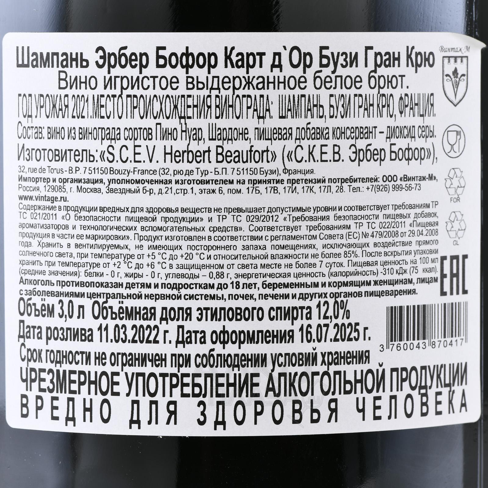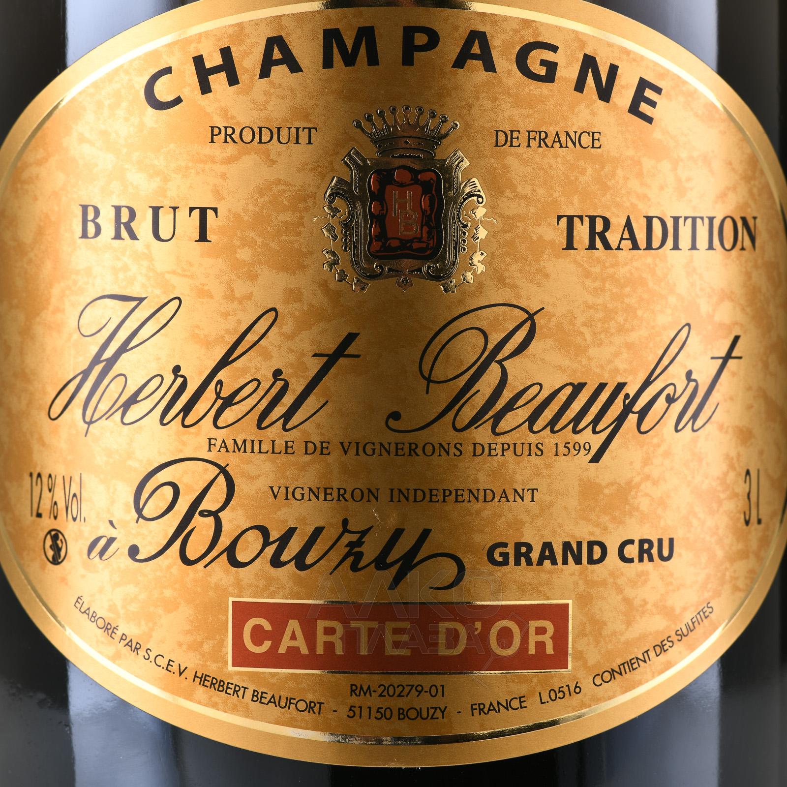 Шампанское белое брют Herbert Beaufort Carte d`Or Bouzy Grand Cru 3 л в д/у создано в коммуне Бузи, одном из величайших терруаров Монтань-де-Реймс. Здесь доминируют южные склоны с богатой меловой почвой, которая обеспечивает лозам стабильный дренаж и высокое содержание минералов. Умеренно прохладный климат с достаточным количеством солнечных дней делает ягоды концентрированными. Виноград собирают вручную, а базовые вина из него ферментируют малыми партиями при контролируемой температуре. Дальнейшее вторичное брожение проходит в бутылке по классическому методу, а выдержка на осадке занимает несколько лет. Увеличенный формат усиливает эффект длительного созревания и подчёркивает насыщенность ароматики.