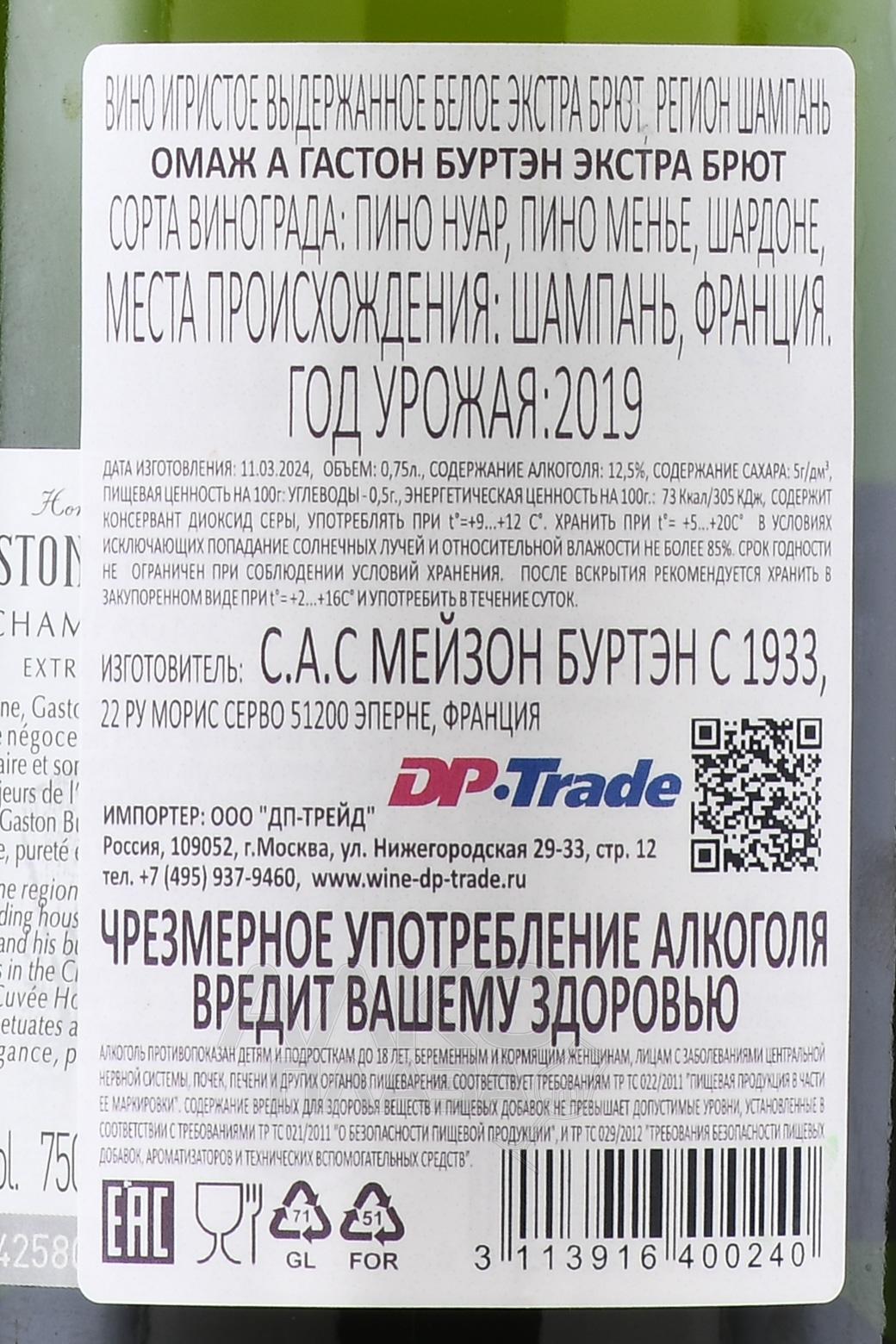 Hommage a Gaston Burtin Extra Brut - шампанское Омаж а Гастон Буртэн Экстра Брют 0.75 л белое экстра брют