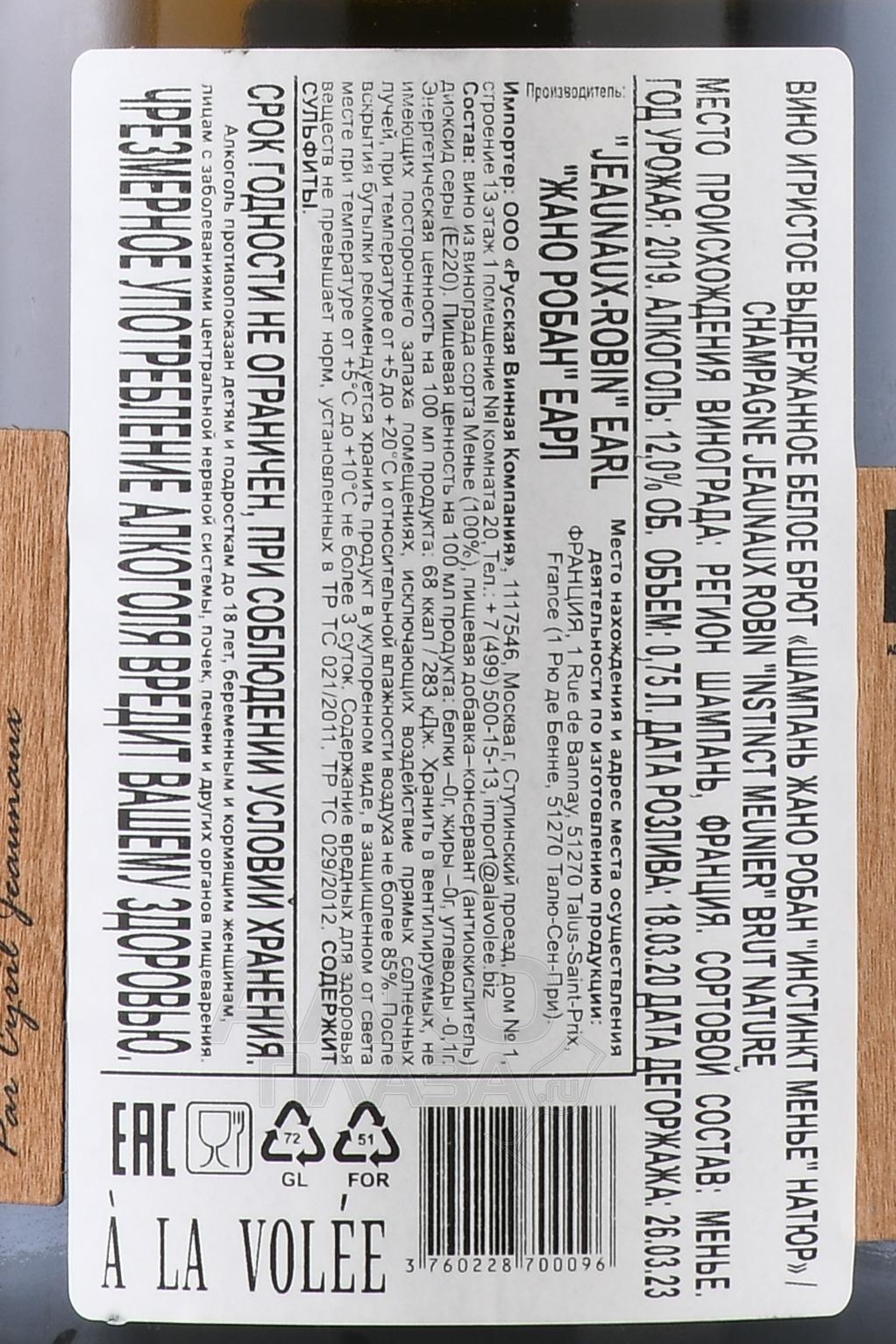 Шампанское Jeaunaux-Robin Instinct Meunier Nature 2019 года 0,75 л — это изысканное игристое вино, созданное в коммуне Талю-ан-Шампань, где виноградники семьи Жоно-Робен расположены на глинисто-меловых почвах Кот де Блан. Год урожая 2019 был тёплым и сухим, что позволило ягодам набрать оптимальный баланс сахаров и кислотности. Виноделы использовали исключительно сорт Пино Менье, отражая его естественную силу и ароматическую выразительность. Первичная ферментация проходила в дубовых бочках с использованием природных дрожжей, без добавления сахара при дегоржаже (Натюр). Выдержка на осадке длилась более 30 месяцев, что придало шампанскому гармонию и глубину. Оно получило признание критиков за чистоту стиля и энергию терруара, подтверждая высокий уровень ремесленного подхода хозяйства Jeaunaux-Robin.