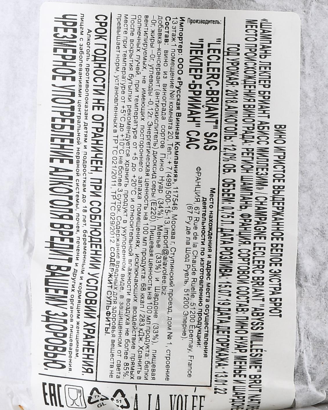 Шампанское белое брют-натюр Leclerc Briant Abyss Millesime 0,75 л в п/у производится исключительно из винограда одного урожая, что отражено в названии релиза. Виноград для его создания поступает с органических и биодинамических участков Шампани, где лозы растут на меловых и известняковых почвах морского происхождения. Климат региона — прохладный, с выраженным влиянием Атлантики, что обеспечивает высокую кислотность и точную структуру базовых вин. Особенность кюве заключается в дополнительной выдержке: после традиционной бутылочной ферментации и выдержки на осадке бутылки помещаются на океаническое дно. Подводное созревание при стабильной температуре, в полной темноте и под естественным давлением, что определяет характер напитка. Дозаж отсутствует, стиль brut-nature подчёркивает чистоту терруара и сырья.