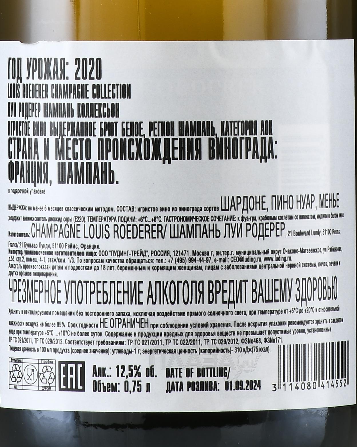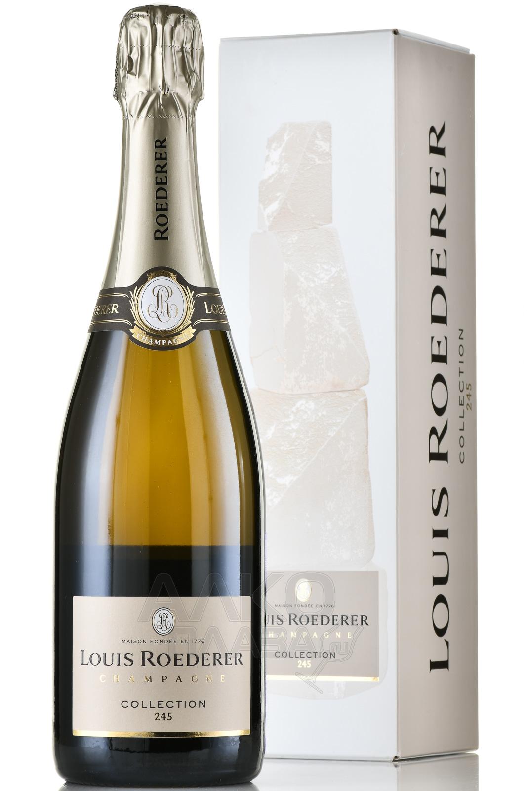 Белое шампанское-брют Louis Roederer Collection 245 0,75 л в п/у послужит сувениром для ценителей элитных французских вин. Напиток создан из ягод с разных участков. В его состав вошли равные доли урожаев из долины реки Марны, из предгорий Монтань-де-Реймс и со склонов холмов Кот-де-Блан. Производитель использовал плоды из собственных угодий и с плантаций партнерских хозяйств. Спиртное изготовили традиционным методом шампенуаз с повторной ферментацией в бутылках и выдержкой на осадке. В ассамбляж добавлено около 40% резервных вин, часть которых быда выдержана в дубе.