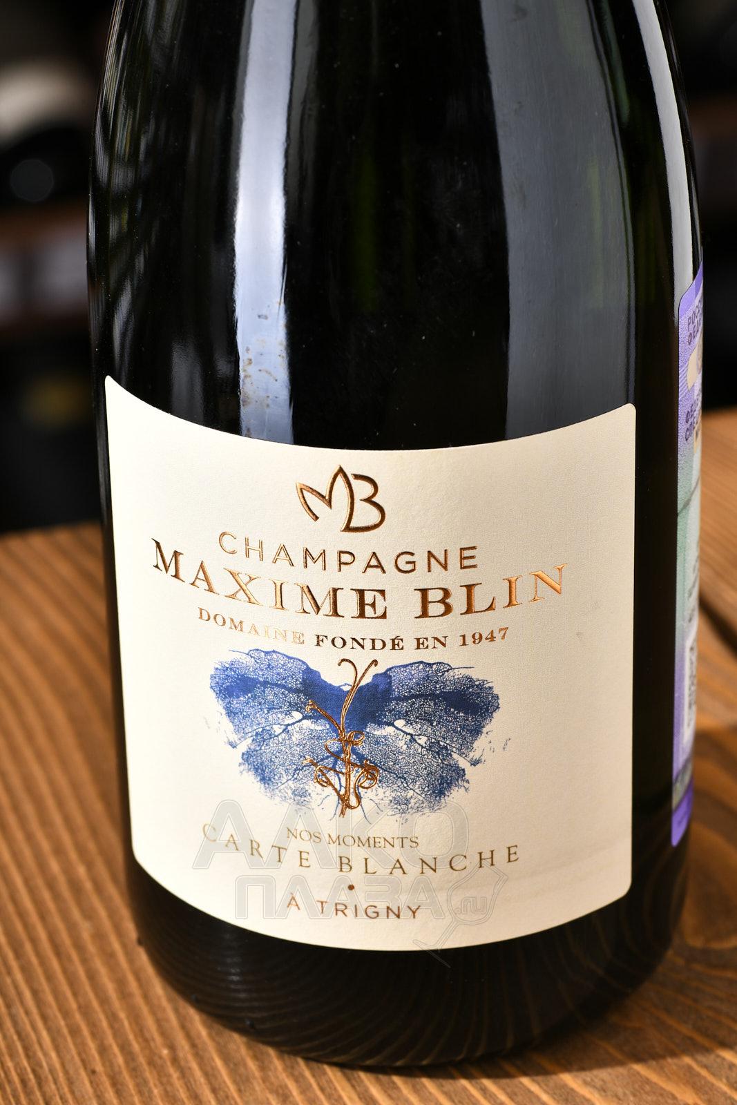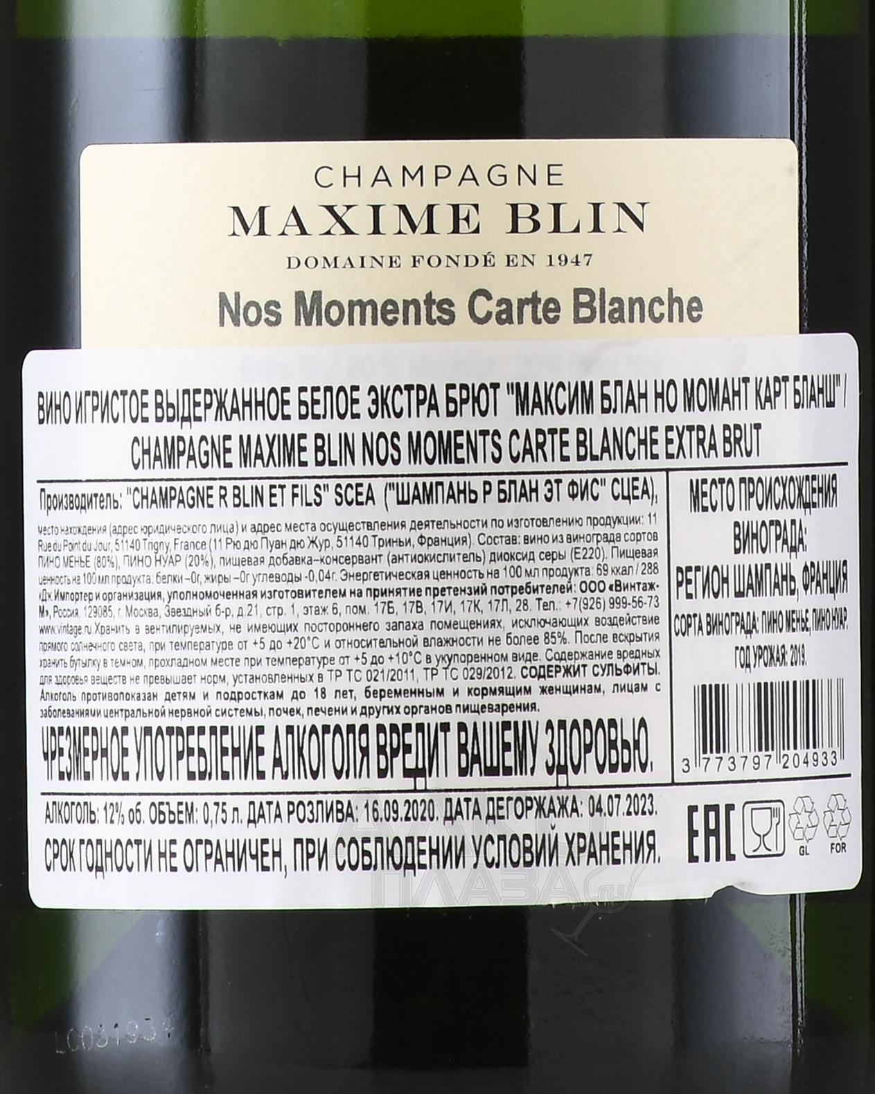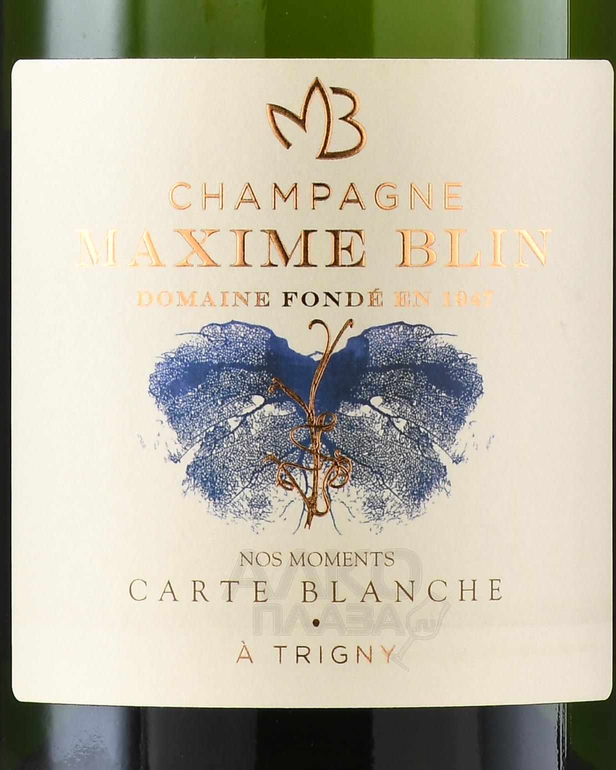 Шампанское белое экстра-брют Maxime Blin Nos Moments Carte Blanche 0,75 л — кюве категории blanc de noirs, созданное как универсальное выражение стиля дома и ориентированное на чистоту вкуса. Основа купажа — Менье, дополненный Пино Нуаром, выращенными в северной части Шампани на виноградниках хозяйства. Участки расположены в терруаре с преобладанием глинисто-известковых почв, традиционных для долины Марны и особенно благоприятных для Менье. Виноградарство ведется по биологическим принципам. После классической шампанской винификации напиток проходит выдержку на осадке в бутылке в течение 36 месяцев. Умеренный дозаж сохраняет баланс между свежестью и округлостью, формируя стиль, рассчитанный на лёгкое восприятие и гастрономическую гибкость.