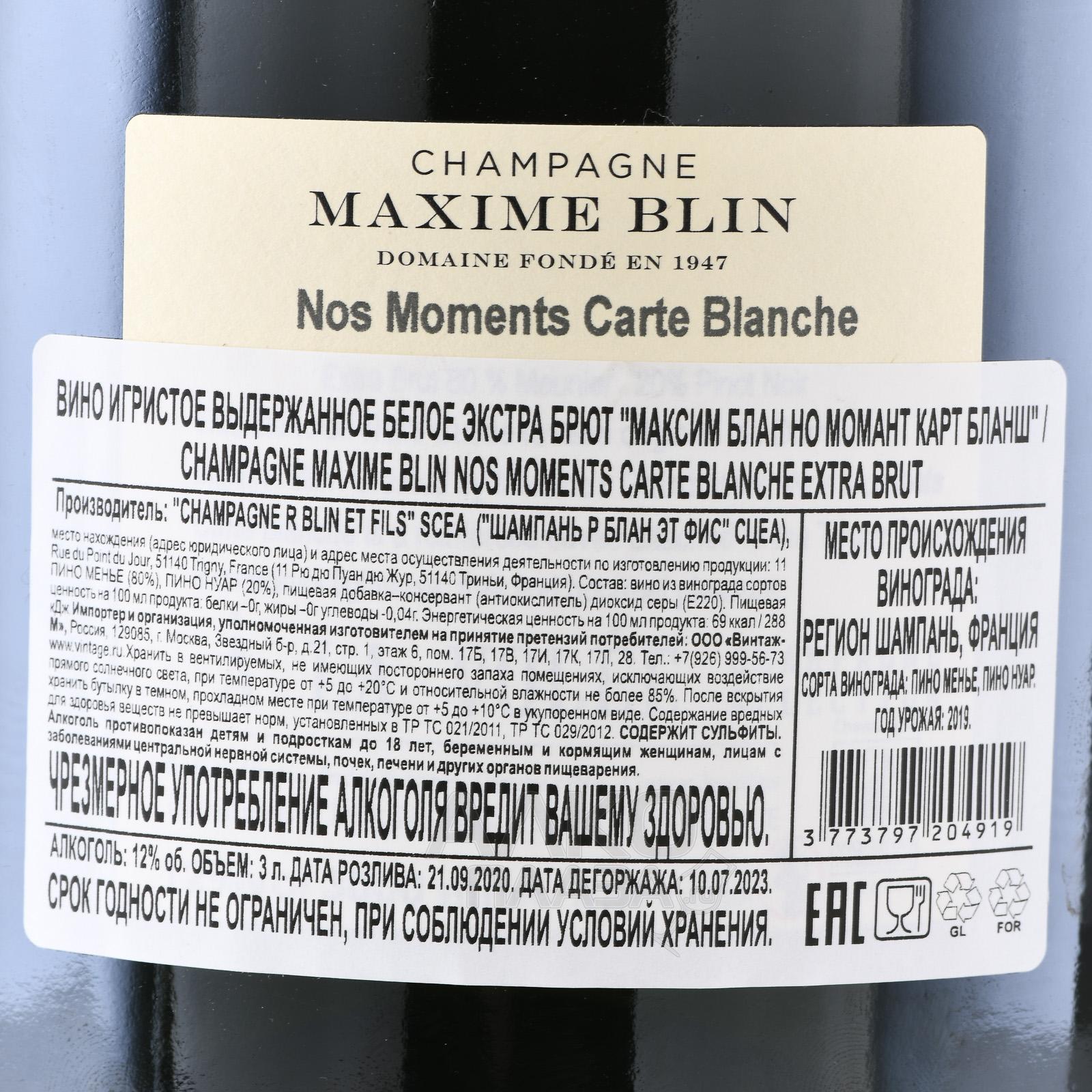 Шампанское белое экстра-брют Maxime Blin Nos Moments Carte Blanche 3 л создаётся в долине Марны, где виноградники хозяйства расположены на склонах с глинисто-известковыми почвами, традиционными для этого участка Шампани. Кюве относится к стилю blanc de noirs и основано преимущественно на сорте Менье, который в данном терруаре даёт выразительную фруктовость и мягкую структуру. Ассамбляж формируется с акцентом на доступность и чистоту вкуса. Выдержка на осадке длится не менее 36 месяцев, что подтверждено информацией производителя и обеспечивает гармонию без утяжеления профиля. Умеренный дозаж сохраняет свежесть и подчёркивает естественный баланс. Внушительный формат способствует более плавному развитию вина и стабильности органолептики после дегоржажа. Стиль задуман как универсальный, подходящий для разных поводов и сочетаний.