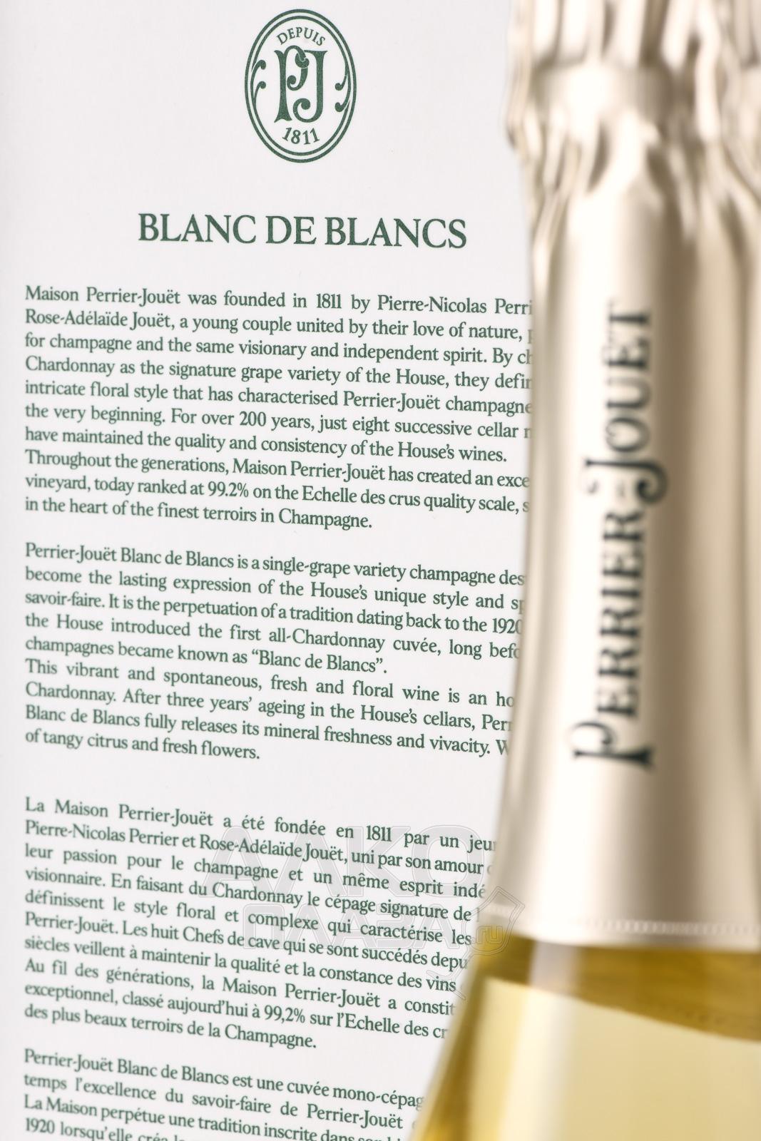 Шампанское Perrier Jouet Blanc de Blanc 0,75 л в п/у создано из винограда, выращенного на лучших участках Шампани с известняковыми почвами. В основном использовался урожай 2020 года, который отличался умеренной погодой с теплым летом и достаточным количеством осадков, что позволило ягодам сохранить свежесть и сбалансированную кислотность. Также в кюве добавлено 15% резервного вина. Для производства использован классический метод шампанизации с брожением в бутылке. Выдержка на осадке — 3 года, что обеспечило игристому вину объем и тонкую кремовую текстуру. Это шампанское получило высокие оценки от критиков: 93 балла от Wine Spectator («Незаурядное») и 92 балла от Роберта Паркера («Экстраординарное»).