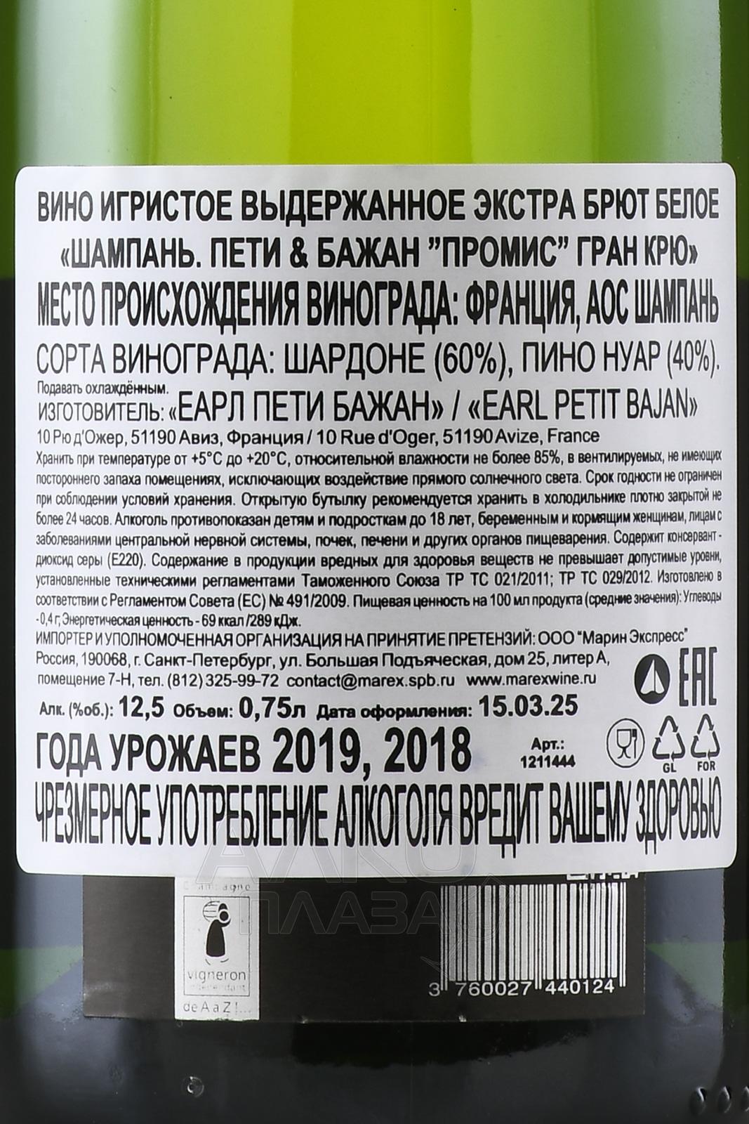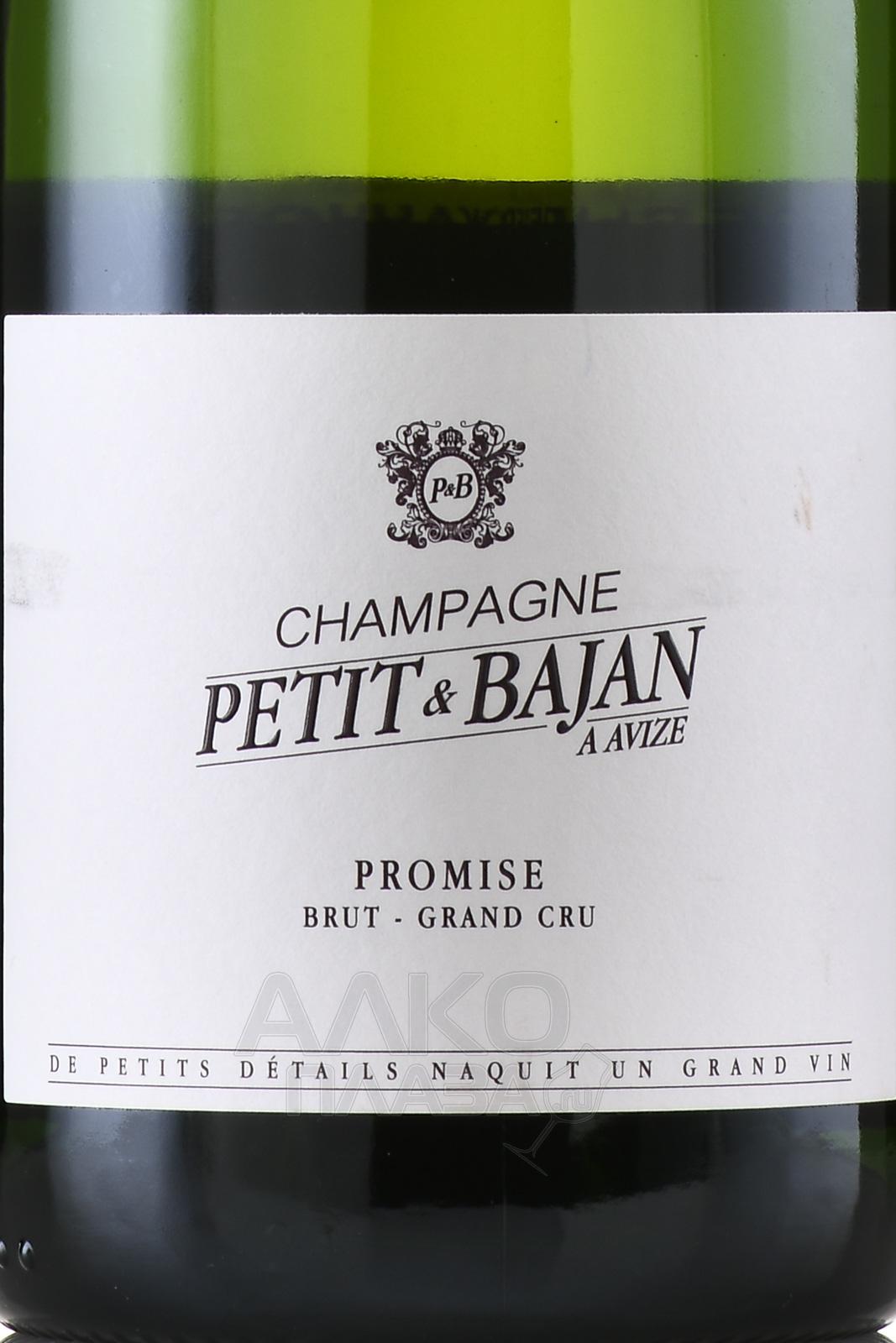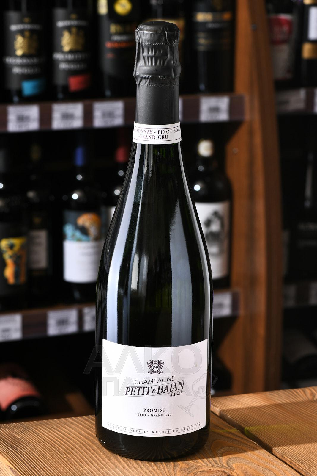 Шампанское белое брют Petit & Bajan Promise Grand Cru 0,75 л производится во французском регионе Шампань. Для создания кюве используют виноград с участков коммуны Авизе и Верзене со статусом Гран Крю в зоне Кот-де-Блан. Здесь преобладают меловые почвы, способные удерживать влагу и отражать тепло. Они придают напиткам чёткость, минеральную строгость и устойчивую кислотную основу. Климат — прохладный, с долгим периодом созревания ягод, что способствует формированию сдержанного и точного стиля. Напиток создаётся традиционным методом шампанизации. Первичная ферментация проходит в нейтральных ёмкостях, вторичное брожение осуществляется в бутылке. Выдержка на осадке продолжается не менее установленного апелласьоном срока.