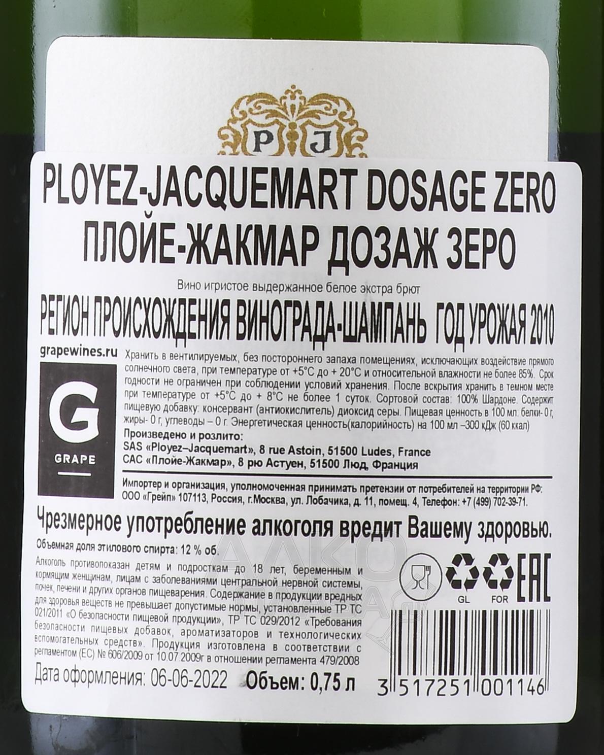 Шампанское белое брют Ployez Jacquemart Dosage Zero 0,75 л создано в самом центре региона Монтань-де-Реймс, где виноградники растут на меловых и известняковых почвах. Этот терруар придаёт вину минеральность и тонкость, сохраняя свежесть даже после долгой выдержки. Напиток отличается тем, что не содержит добавленного сахара. Это делает его максимально чистым и аутентичным выражением стиля хозяйства. В производстве используют ручной сбор урожая и традиционный метод шампанизации с длительным вторичным брожением в бутылке. Выдержка на осадке не менее трёх лет формирует сложный букет и гармоничную текстуру.