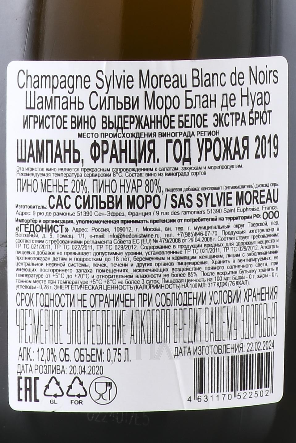 Шампанское белое экстра-брют Sylvie Moreau Blanc de Noirs 0,75 л создаётся из красного винограда, выращенного на холмистых участках Монтань-де-Реймс. Терруар известен меловыми и кремнистыми почвами, которые удерживают влагу и отражают солнечный свет. Эти особенности помогают ягодам созревать равномерно и сохранять яркую кислотность. Урожай собирают вручную, затем плоды мягко прессуют, чтобы получить чистый светлый сок. Ферментация проходит в стальных резервуарах при контролируемой температуре, что позволяет сохранить точность стиля. Вторичное брожение в бутылке длится не менее 24 месяцев. Низкая дозировка подчёркивает минеральные тона и делает стиль напитка более сухим.