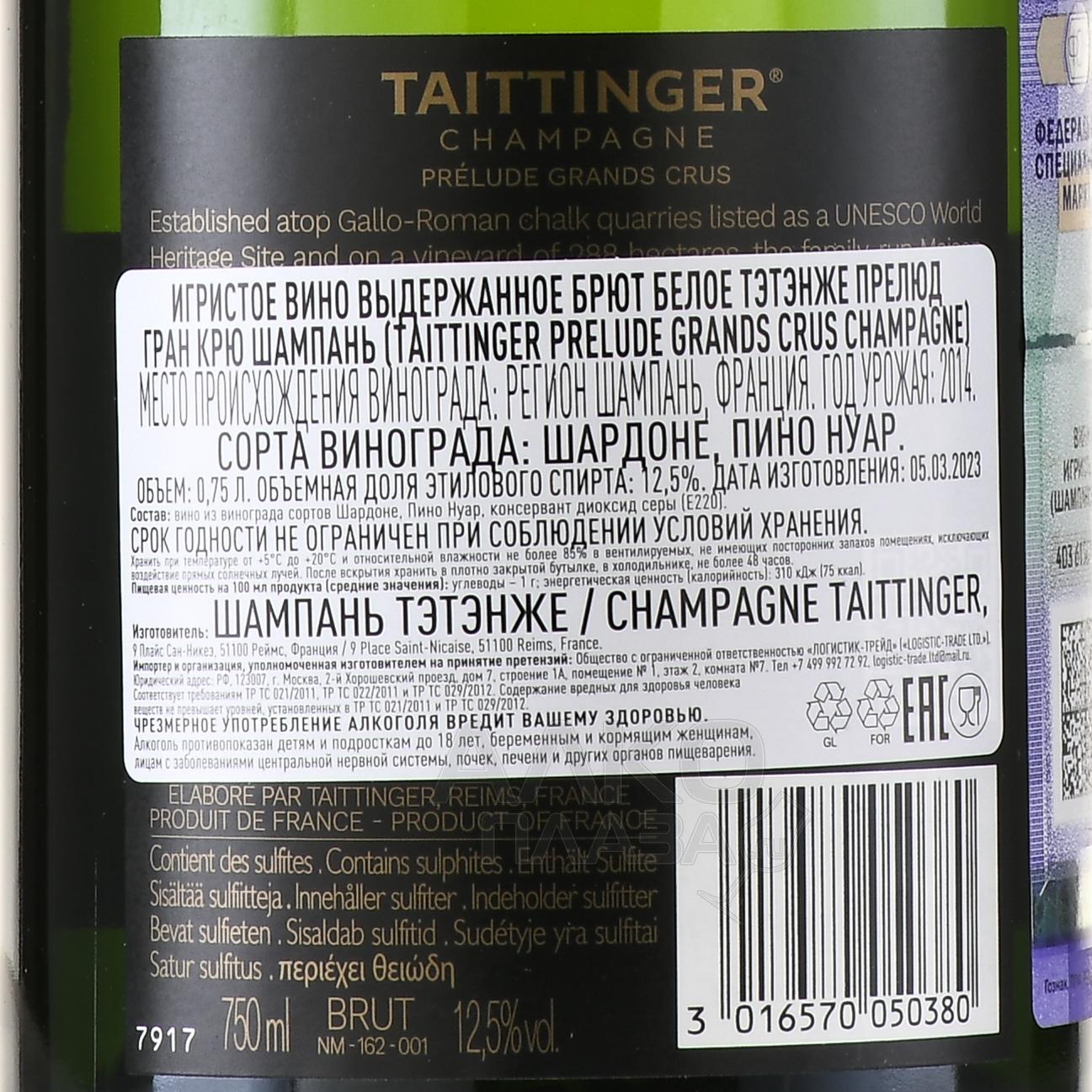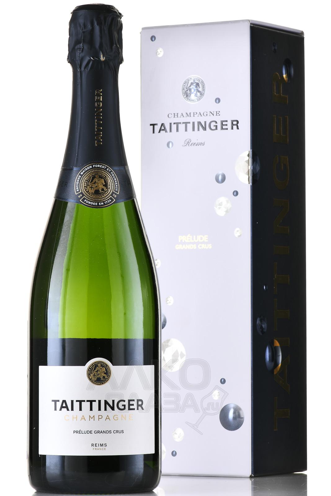 Белое сухое шампанское Taittinger Prelude Grands Crus Brut 0,75 л в п/у — элитный брют, получивший несколько высших наград на самых престижных международных конкурсах. В состав вошли два сорта — Шардоне и Пино Нуар, взятые в равных пропорциях. Сырье выращивается на виноградниках класса Гранд Крю в Кот де Блан и Монтань де Реймс, за счет чего в букете шампанского прослеживаются терруарные нотки. Оно производится по традиционной технологии и выдерживается в течение 5 лет. Брют, представленный в подарочной упаковке, стоит выбрать на роль праздничного презента.