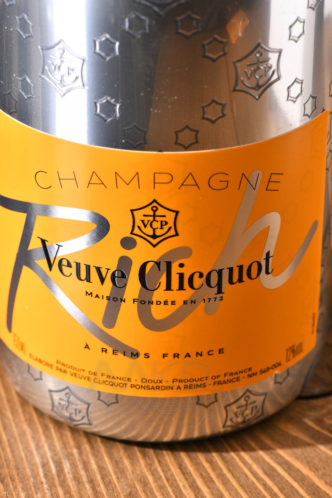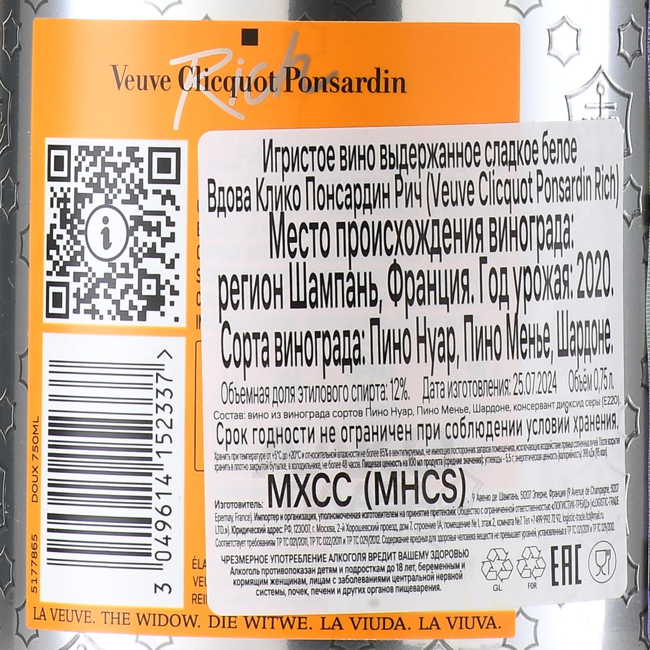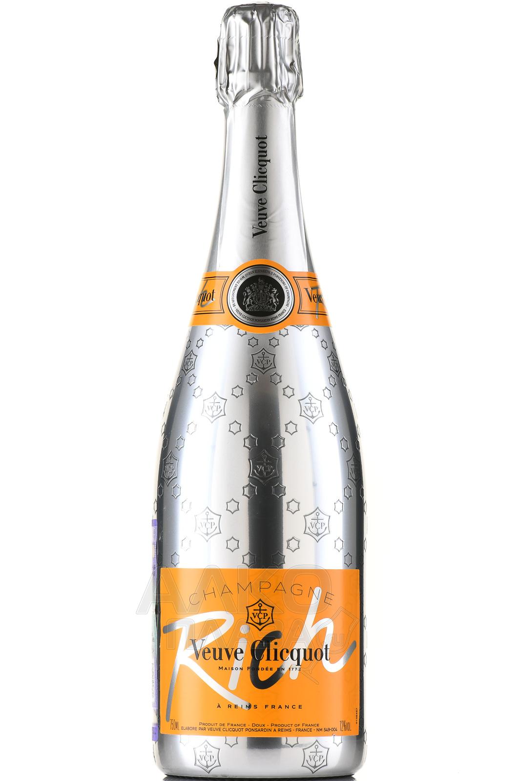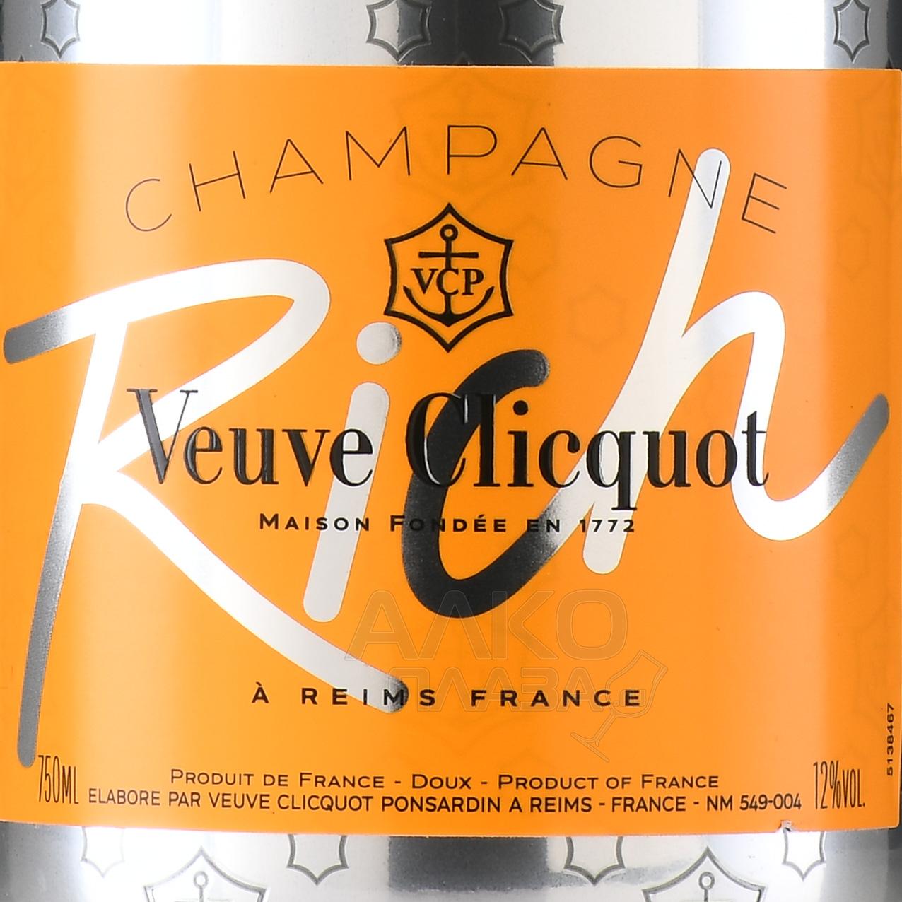 В шампанском Veuve Clicquot, "Rich" White фруктовая нота выведена на совершенно новый уровень. Виноград сорта Пино Нуар (40-45%) в сочетании с высоким содержанием сахара получает новые краски, значительная доля Пино Менье (30-35%) придает вкусу свежесть, яркую фруктовость и изысканность, а небольшая часть Шардоне (20-25%) наполняет его элегантностью. Выдержка шампанского составляет 30 месяцев.