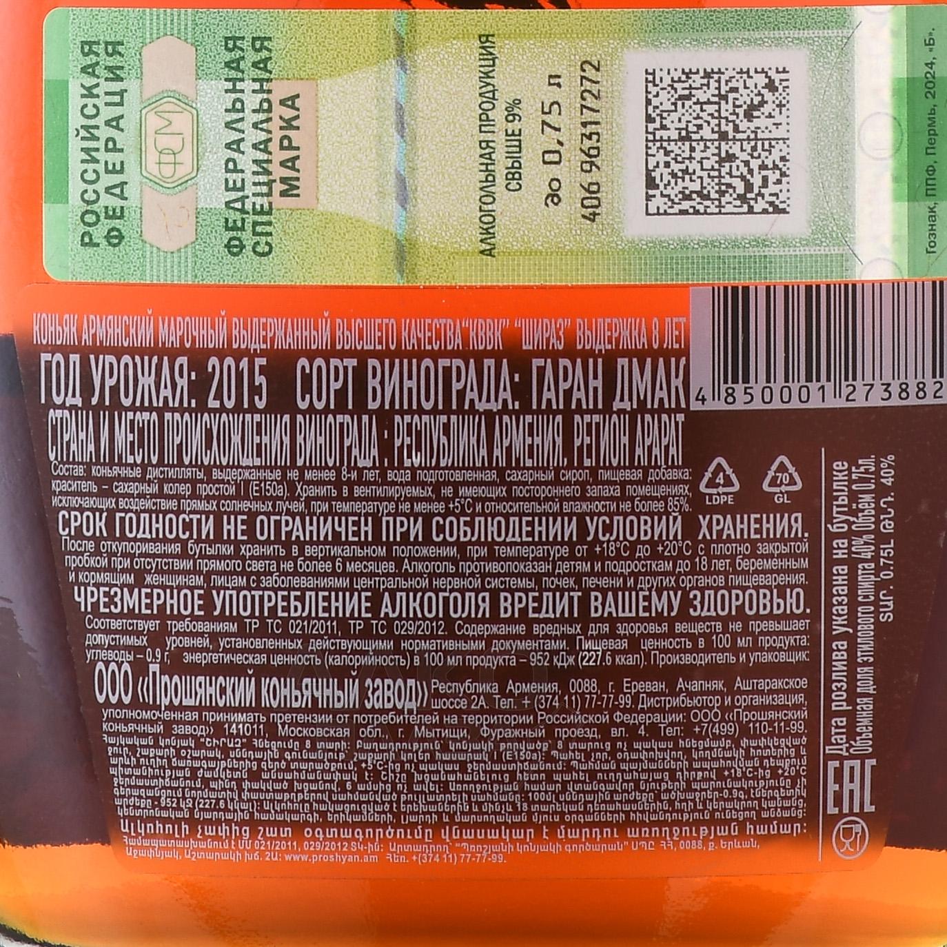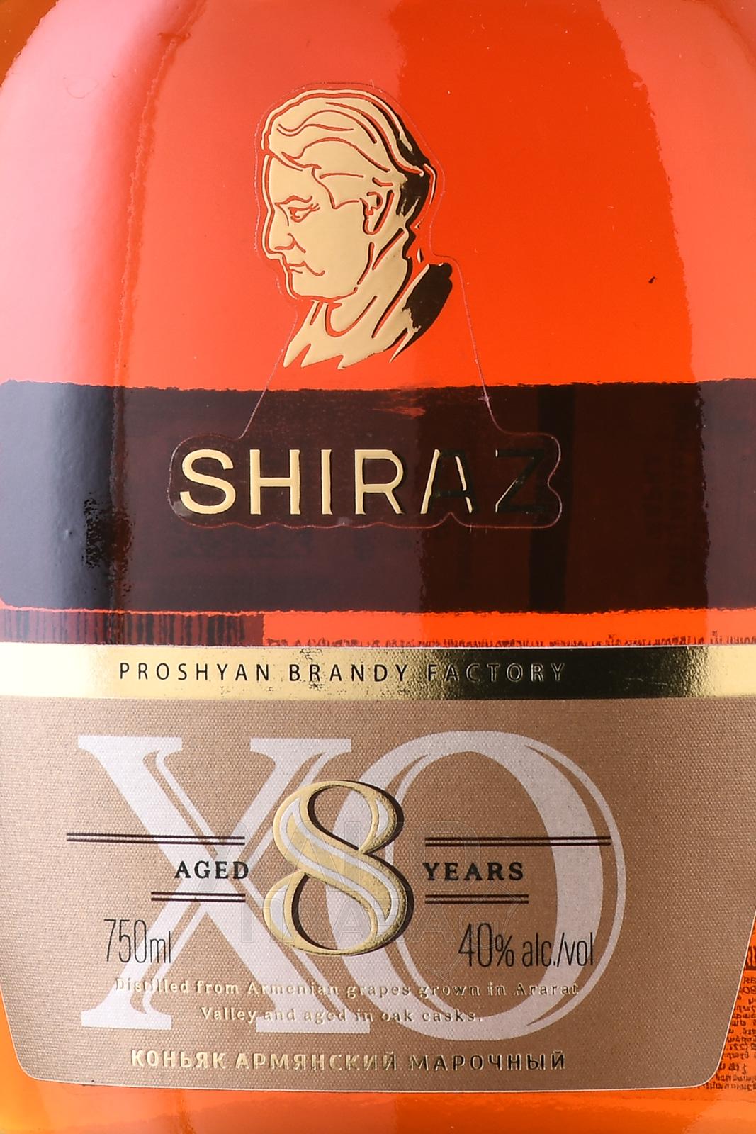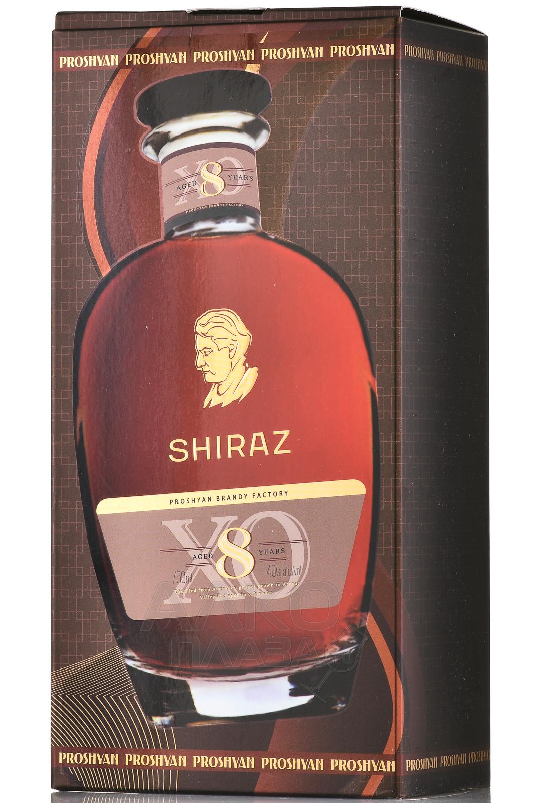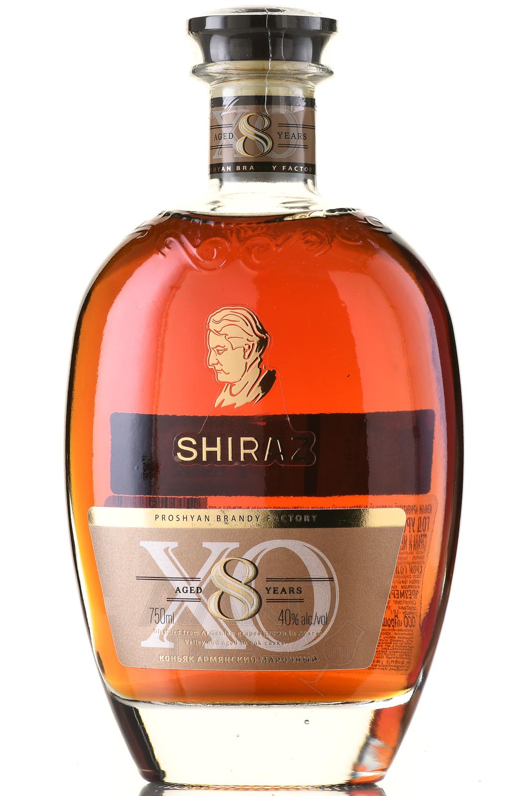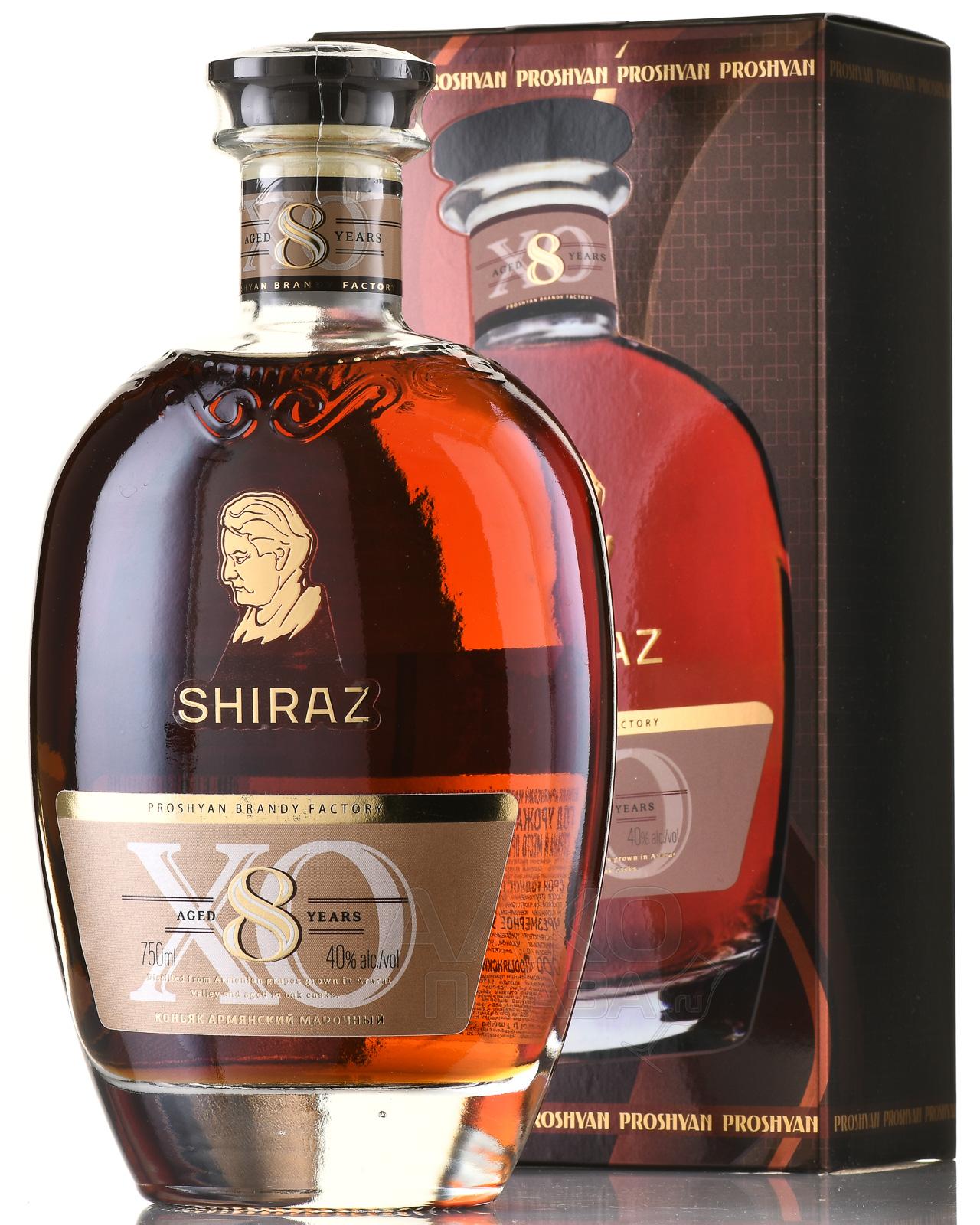 Коньяк Шираз 8 лет 0,75 л — армянский марочный бренди из белого автохтона Гарандмак, выращенного на территории Араратской долины. Сбор винограда проводился ручным способом в 2015 году, непосредственно перед обработкой спелый урожай отсортировали в несколько этапов. На Прошянском коньячном заводе были выполнены ферментация сусла, а также двойная дистилляция и выдержка в дубовых бочках сроком от восьми лет. Сорокаградусный коньяк, созданный в честь известного поэта Ованеса Шираза, поставляется в стильной бутылке с изображением автора. Графин сопровождается сувенирной коробкой из коричневого картона, что делает эту версию памятным подарком для ценителя крепкого спиртного Армении.