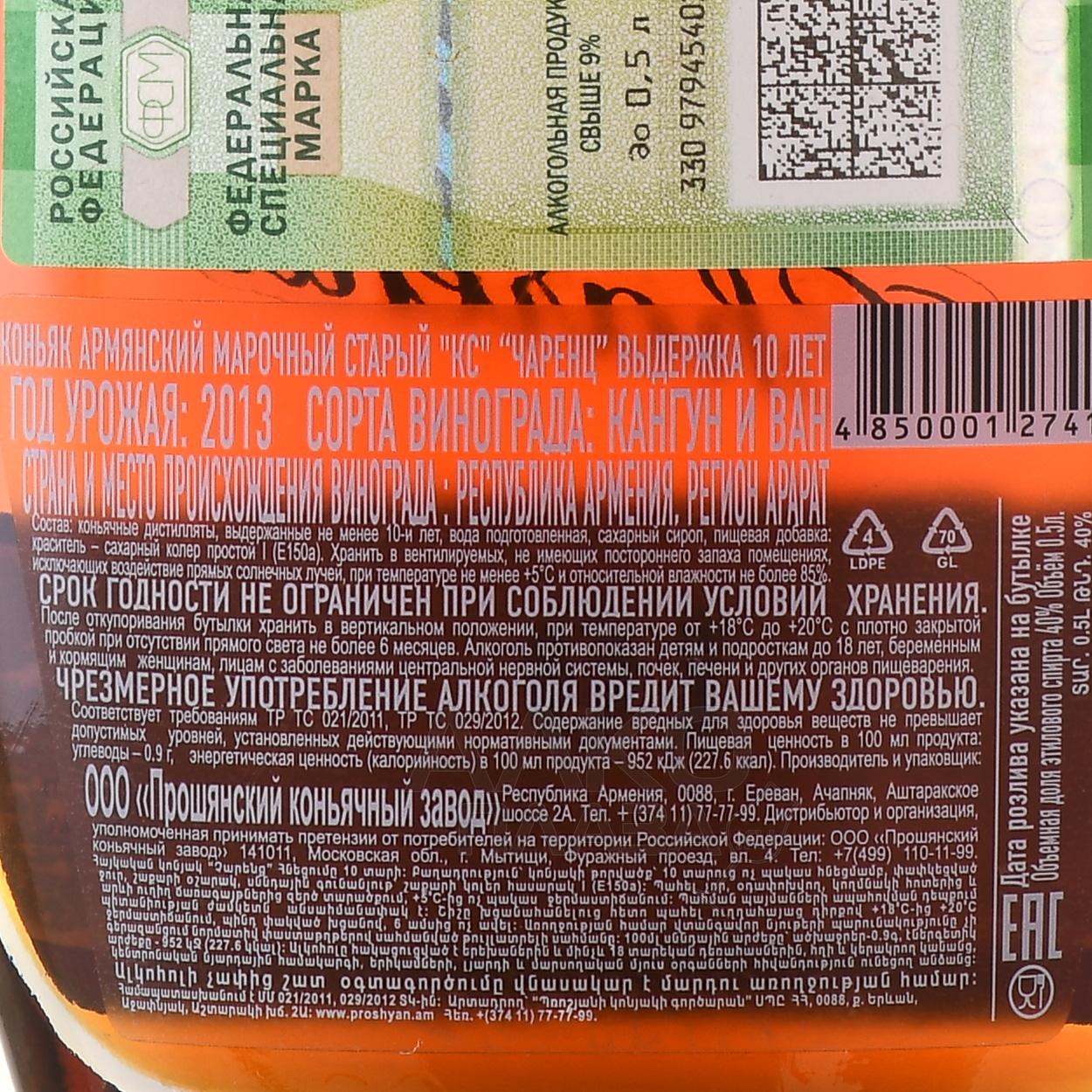 Коньяк Чаренц 10 лет 0.5 л