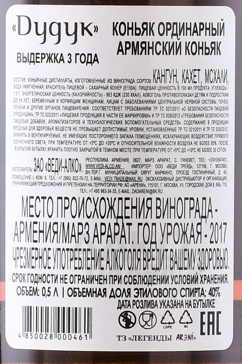 Duduk 3 years - армянский коньяк Дудук 3 года 0.5 л