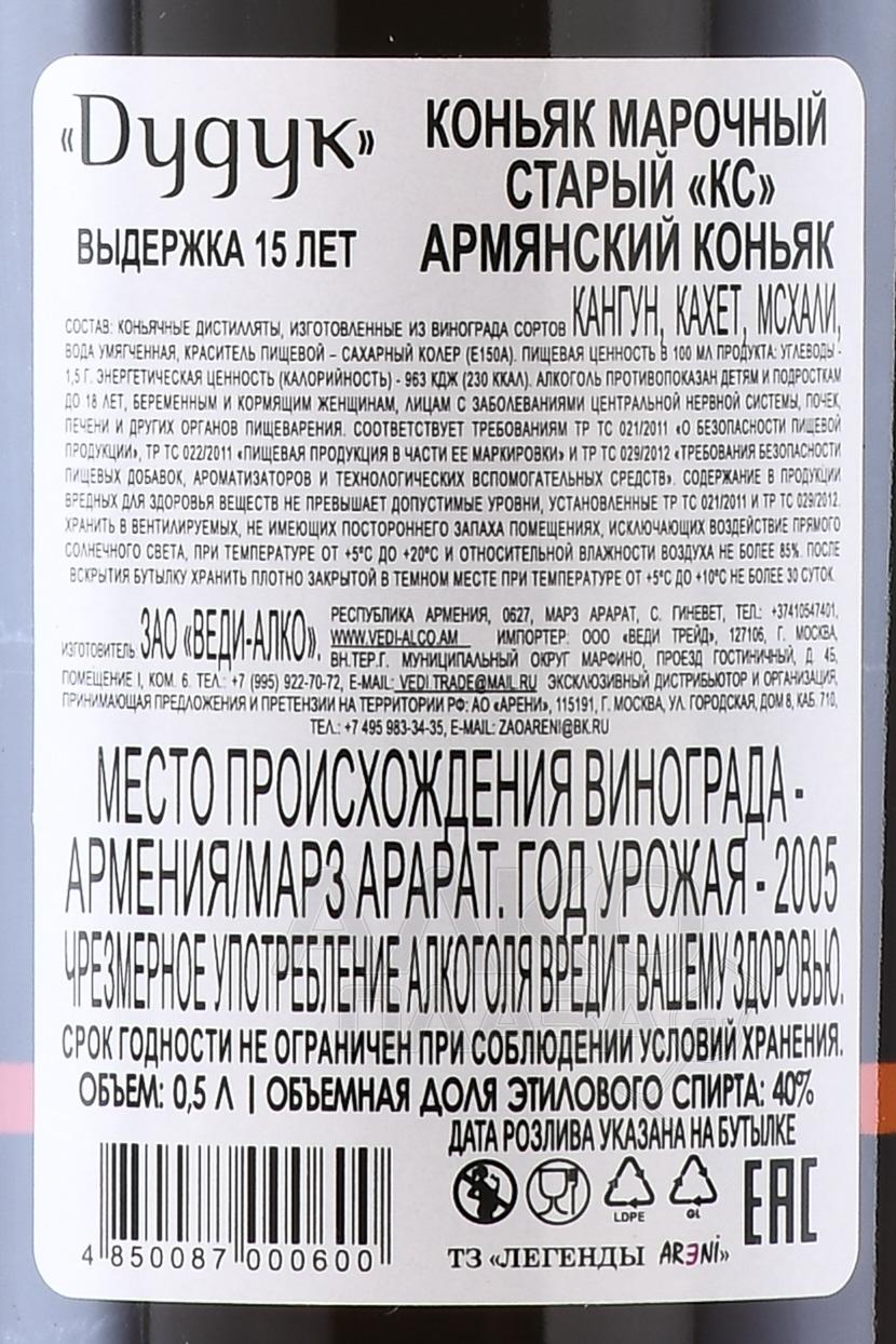 Duduk 15 years - армянский коньяк Дудук 15 лет 0.5 л